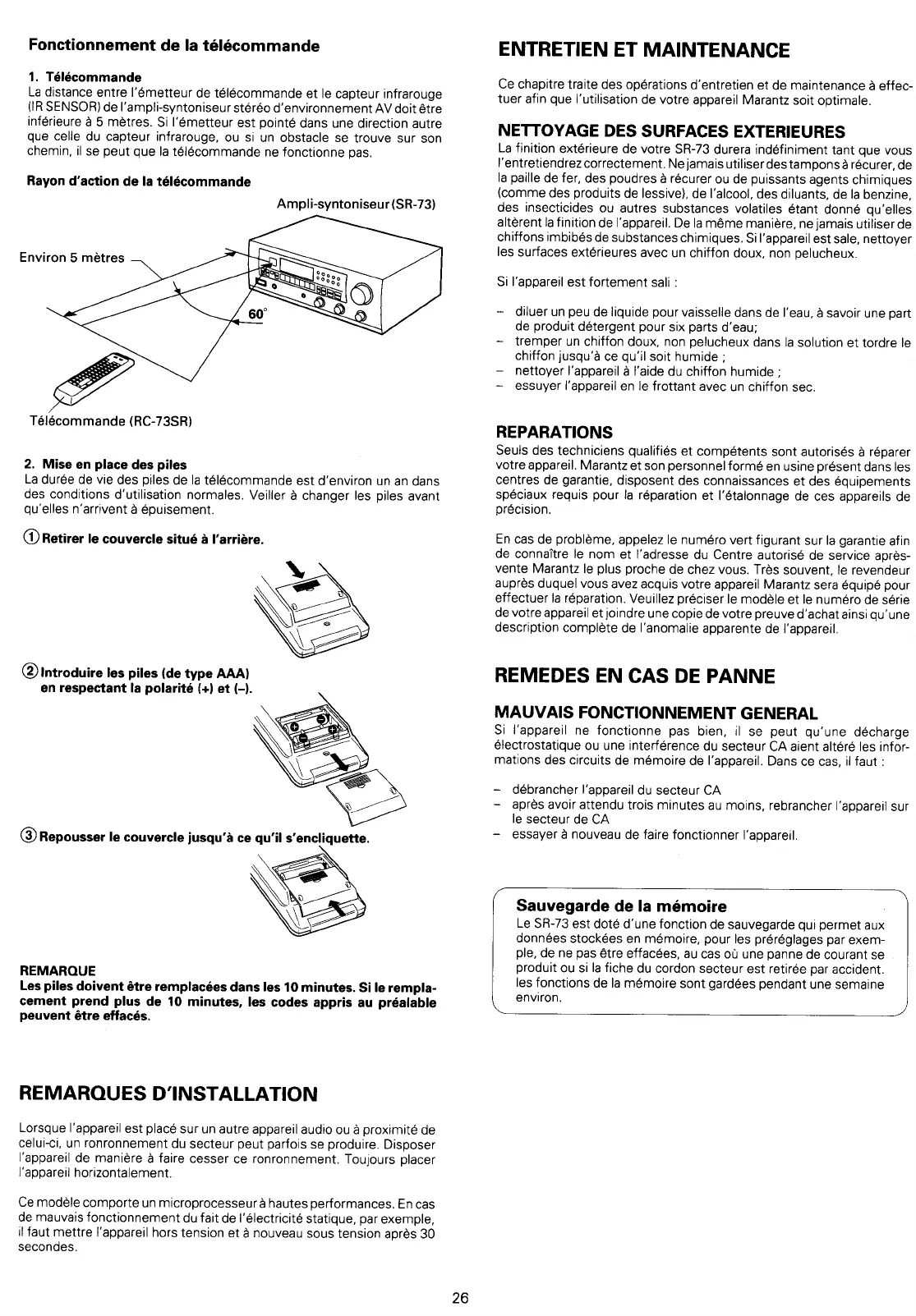 Marantz SR-73 - Fonctionnementdela Télecommand.e; Remarquesdinstallation; Entretien Et Maintenance; Nettovyage des Surfaces Exterieureg