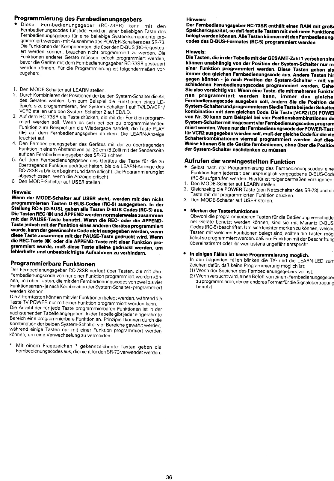 Marantz SR-73 - Programmierung des Fernbedienungsgebets; Programmierbare Funktione; Aufrufen der Voreingesteliten Fumktion
