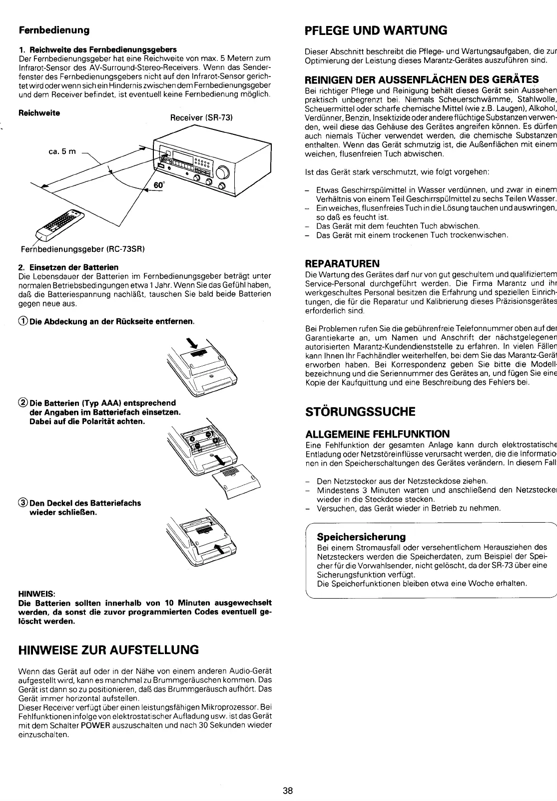 Marantz SR-73 - Fernbedienunn; Hinweise zur Aufstellung; Pflege und Wartung; Reinigen der Aussenflachendes Gerateg