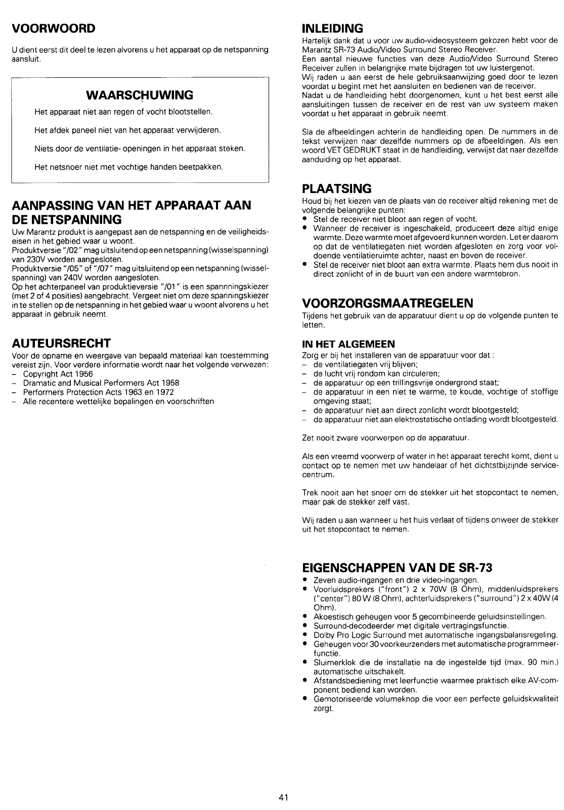 Marantz SR-73 - Eigenschappen Vande Sr-73; Voorwooird; Aanpassing Van Het Apparaat Aan de Netspanning; Auteursrech