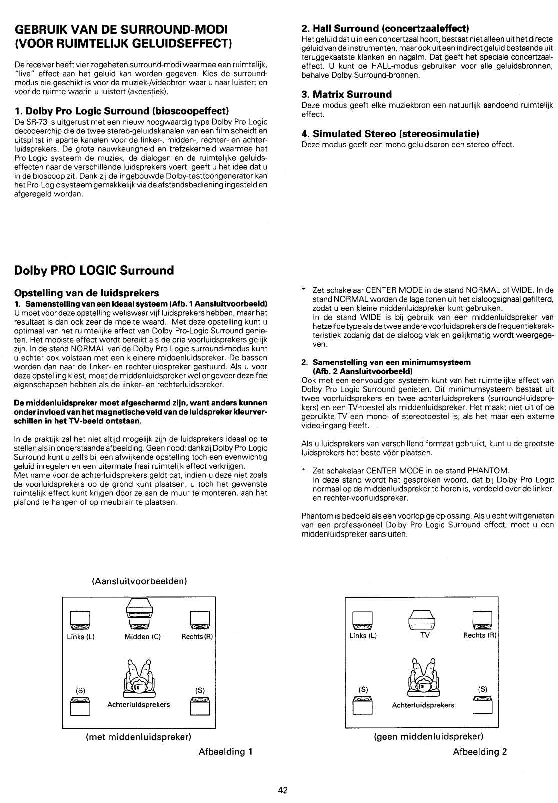 Marantz SR-73 - Dolby Pro Logic Surround; Opstelling Van de Luidsprekers; Gebruik Van de Surround-Modi (Voor Ruimtelijk Geluidseffect)