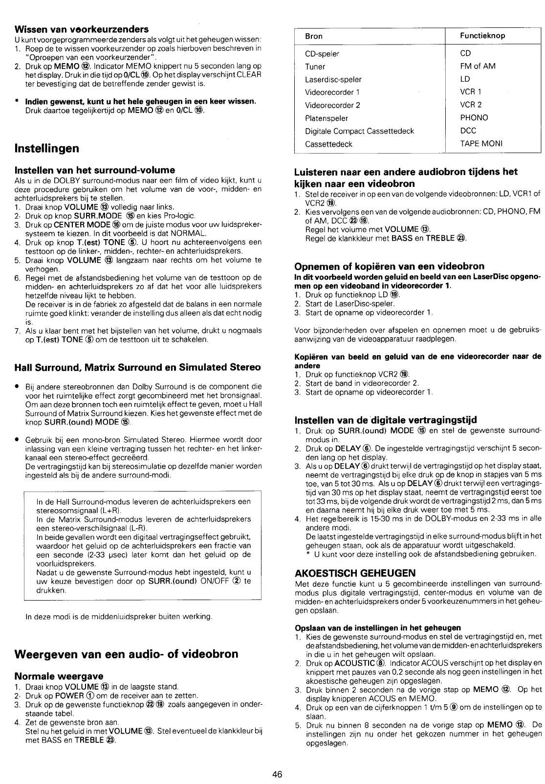 Marantz SR-73 - Wissen Van Voorkeurzenders; Instellingen; Instellen Van Het Surround-VOIUME; Hall Surround, Matrix Surround en Simulated Stereo