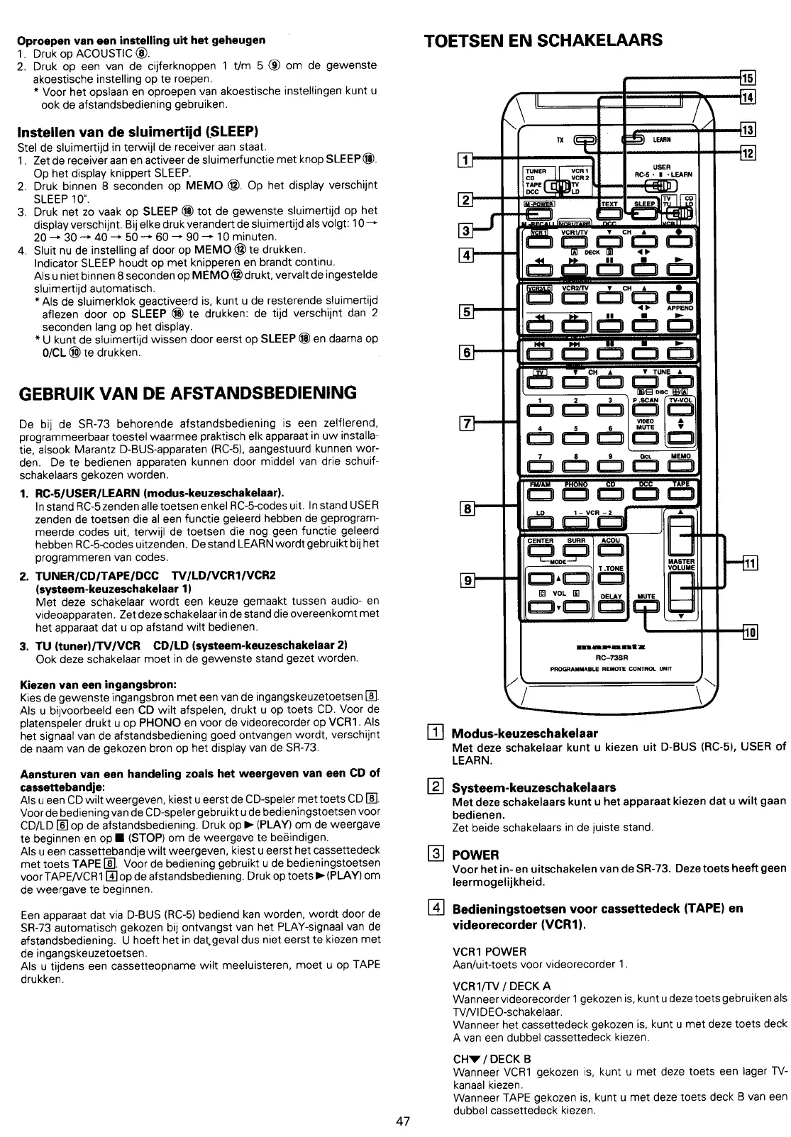 Marantz SR-73 - Instelien Van de Sluimertijd (SLEEP); Gebruik Van de Afstandsbediening; Toetsen en Schakelaarsg