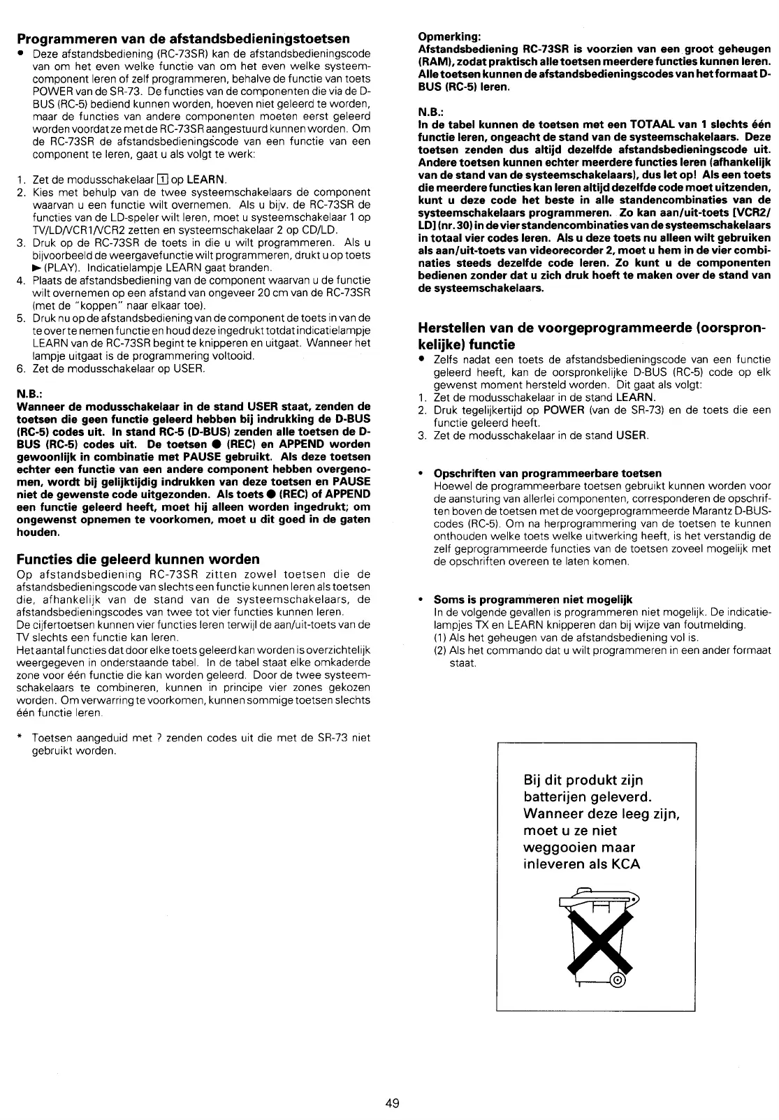 Marantz SR-73 - Programmeren Van de Afstandsbedieningstoetsen; Functies die Geleerd KUMMEN Worden; Herstellen Van de Voorgeprogrammeerde (Oorspronkelijke) Functie