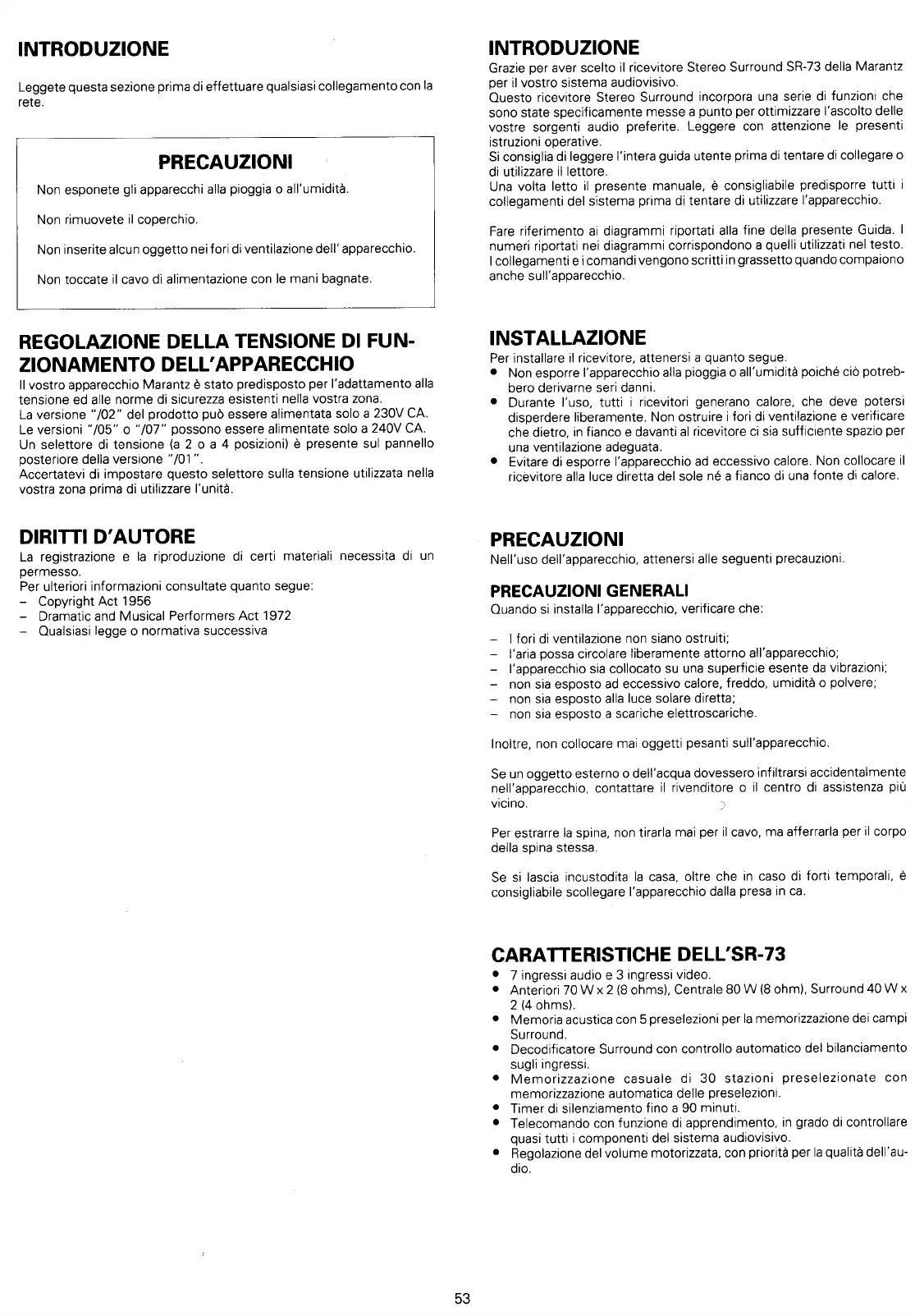 Marantz SR-73 - Caratteristiche Dellsr-73; Installazione; Introduzione; Introduzzione