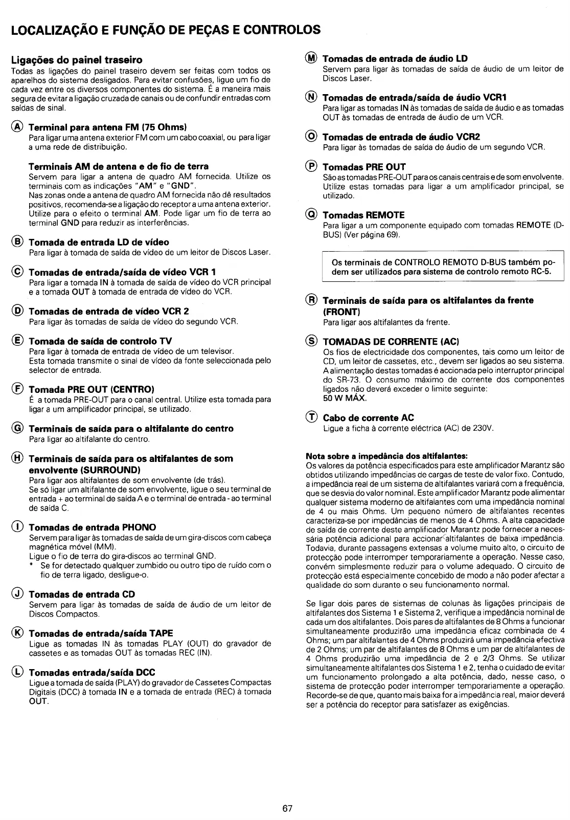 Marantz SR-73 - Localizagao E Fungao de Pegas E Controlog; Ligagges Do Painel Traseiro