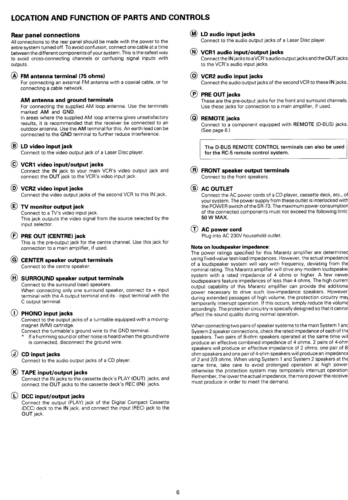 Marantz SR-73 - Marantz SR-73 Controls and Connections Overview; Rear Panel Connection Terminals; Front Panel Controls Identification