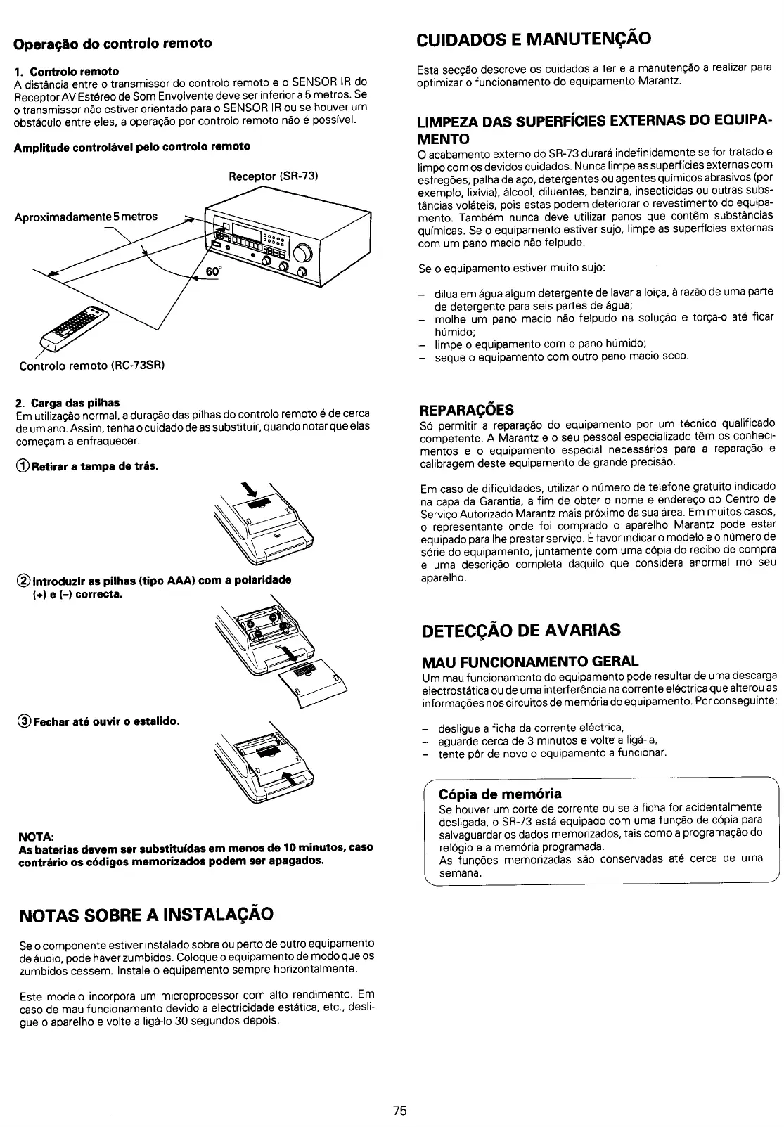 Marantz SR-73 - Operacdo Do Controlo Remoto; Notas Sobrea Instalagao; Cuidados E Manutengao; Limpeza das Superficies Externas Do Equipamento