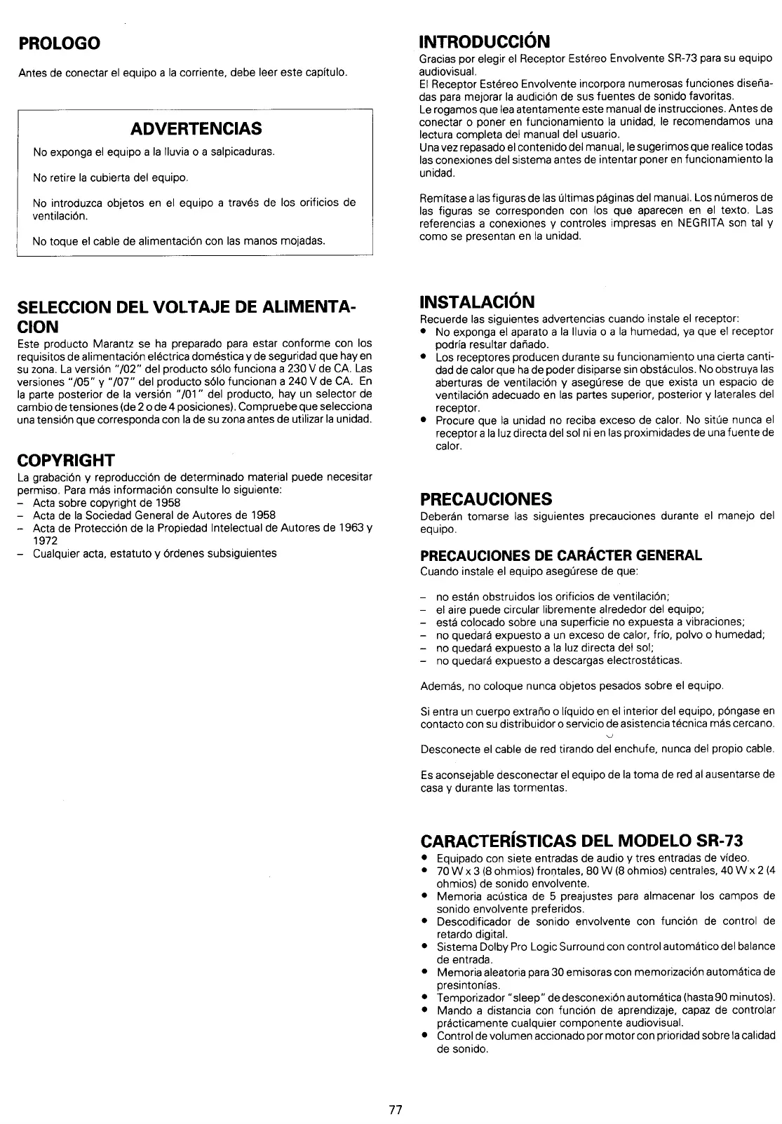 Marantz SR-73 - Caracteristicas del Modelosr-73; Instalacion; Introduccion; Precauciones