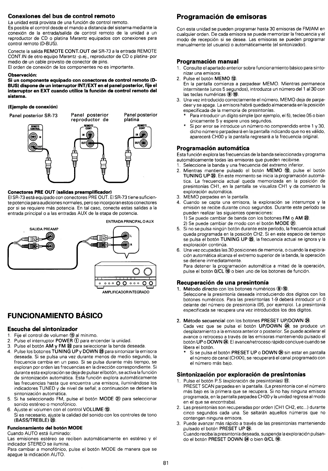 Marantz SR-73 - Conexiones del Bus de Control Remoto; Funcionamientobasico; Escucha del Sintomizadr; Programacionde Emisoras