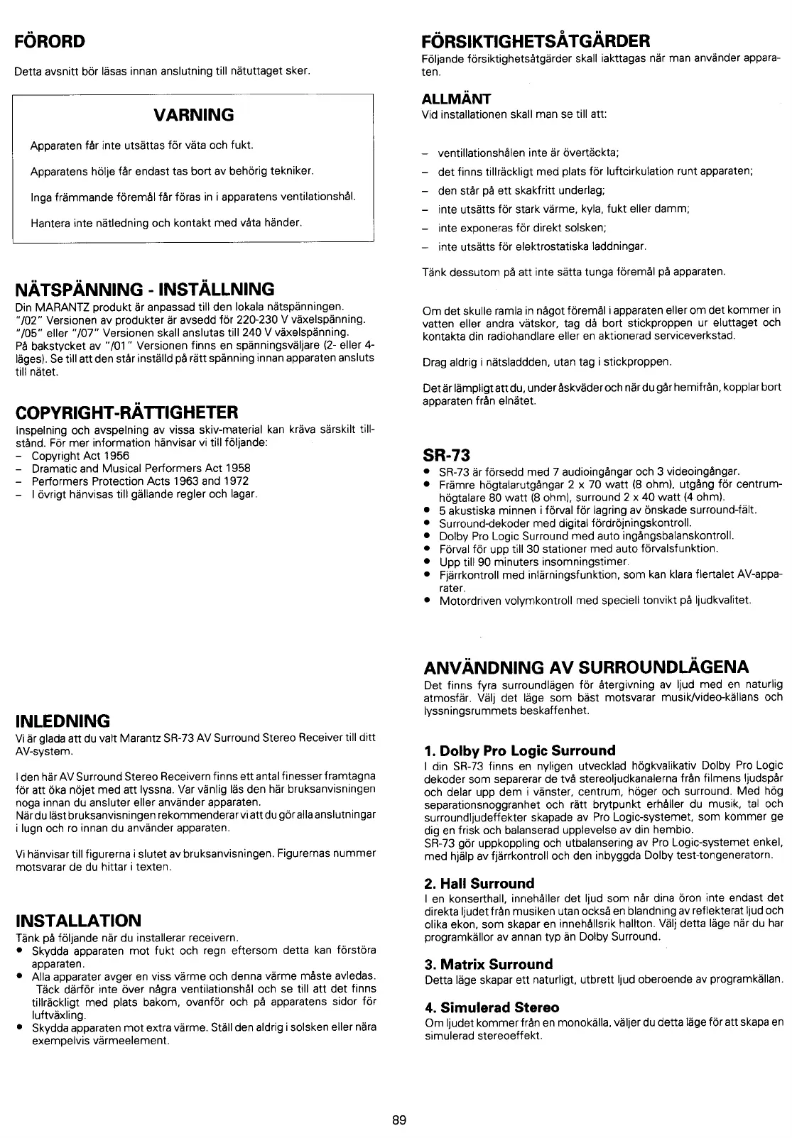 Marantz SR-73 - Anvandning Av Surroundlagena; Ccccccssssccesscetenssscesesseesasscesesseceesauecasaeneensecessueceeenanenseuensansneesensasennesesessanseneaeeseseeesaseaneseneasananenases; Forord; Varniing 1.0
