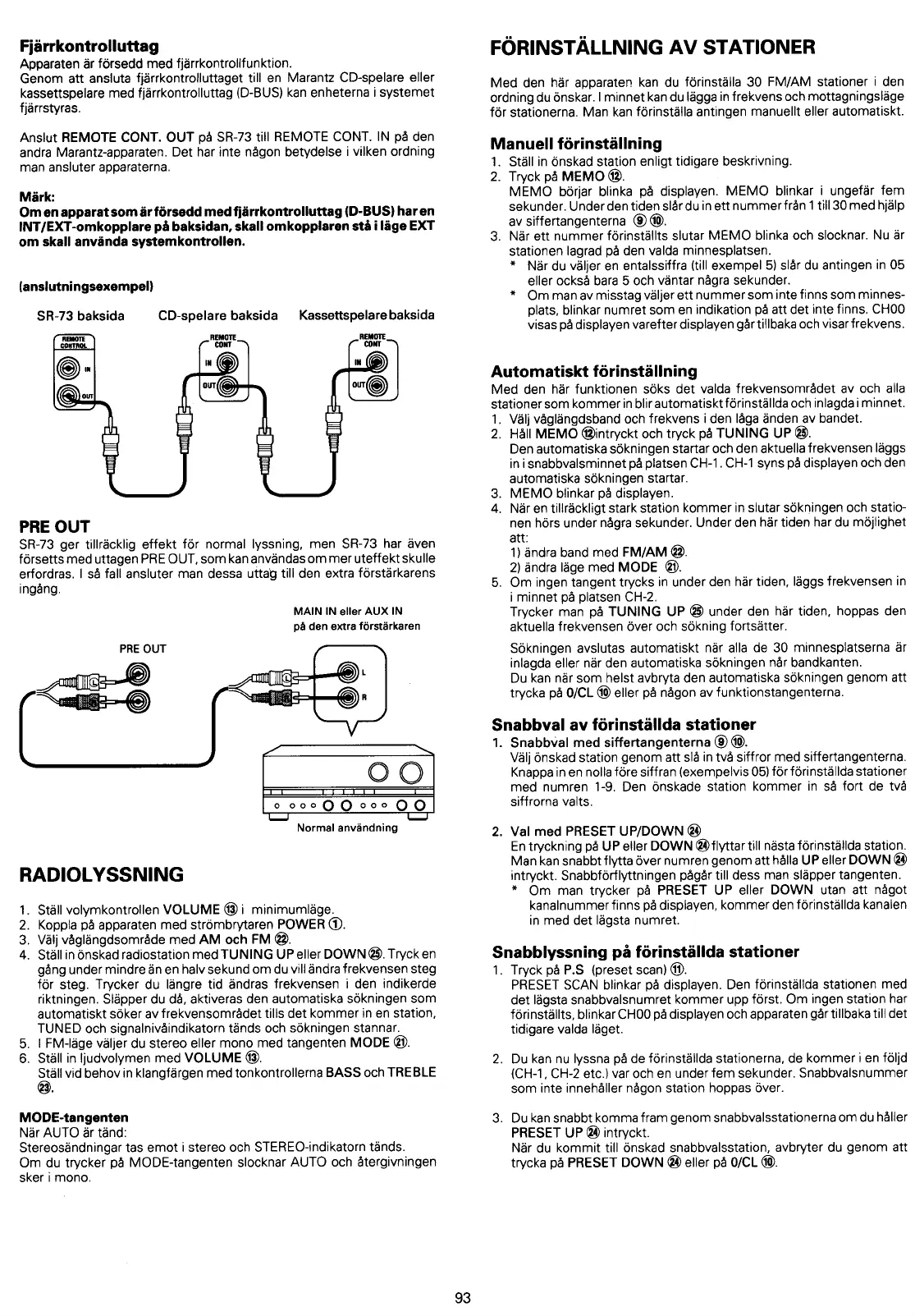 Marantz SR-73 - Fjarrkomtrotluttag; Pre out; Forinstallning Av Stationer; Manuel F6 Rimstallming
