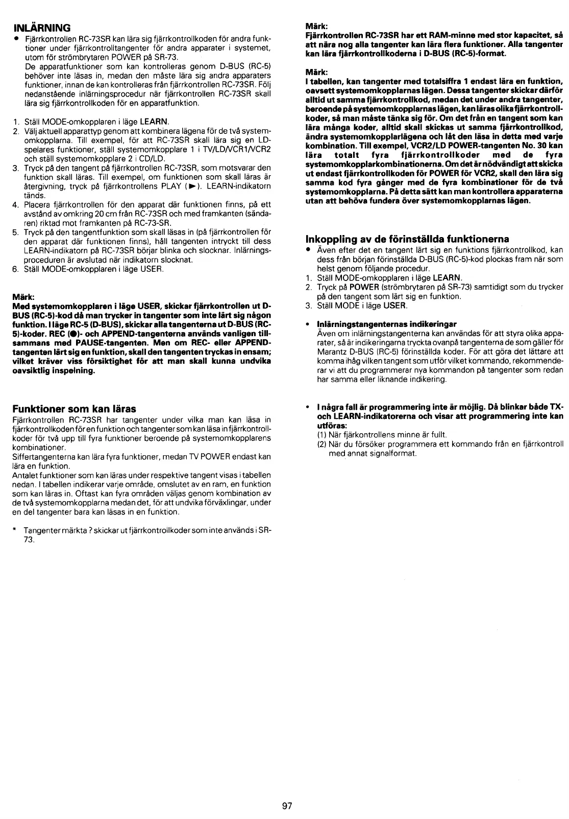 Marantz SR-73 - WDA Ming; Funktioner Som Karn Laras; Inkoppling Av de Foérinstadllda Funktionernar