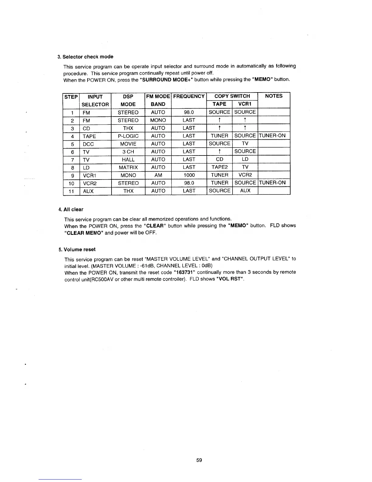 Marantz SR-96 - Selector Check Mode; All Clear; Volume Reset