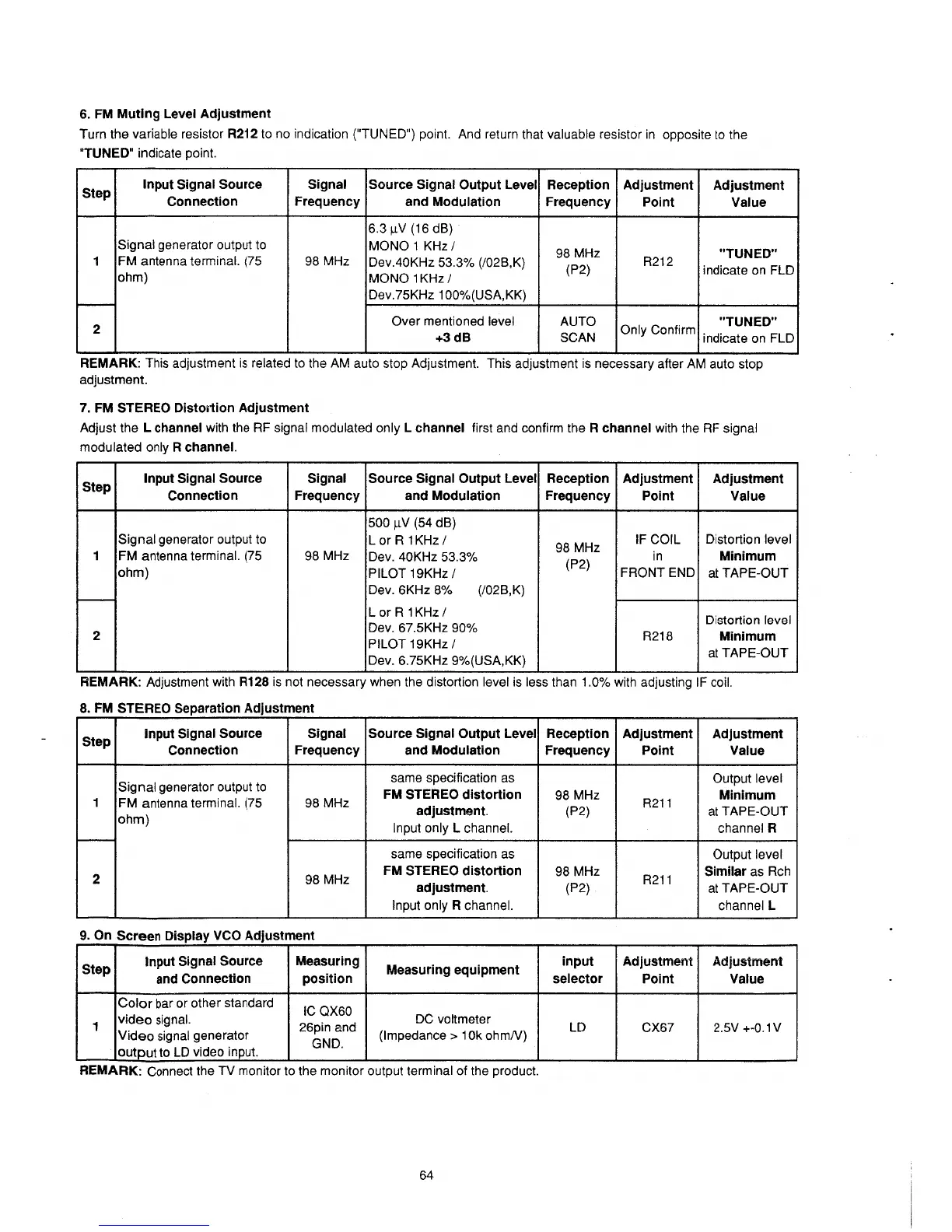 Marantz SR-96 - FM Muting Level Adjustment; FM Stereo Distortion Adjustment; FM Stereo Separation Adjustment; On Screen Display VCO Adjustment