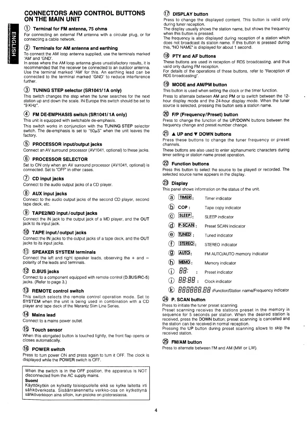 Marantz SR1041 - MAIN UNIT CONTROLS AND CONNECTORS; Input;Output Jacks; Main Unit Controls