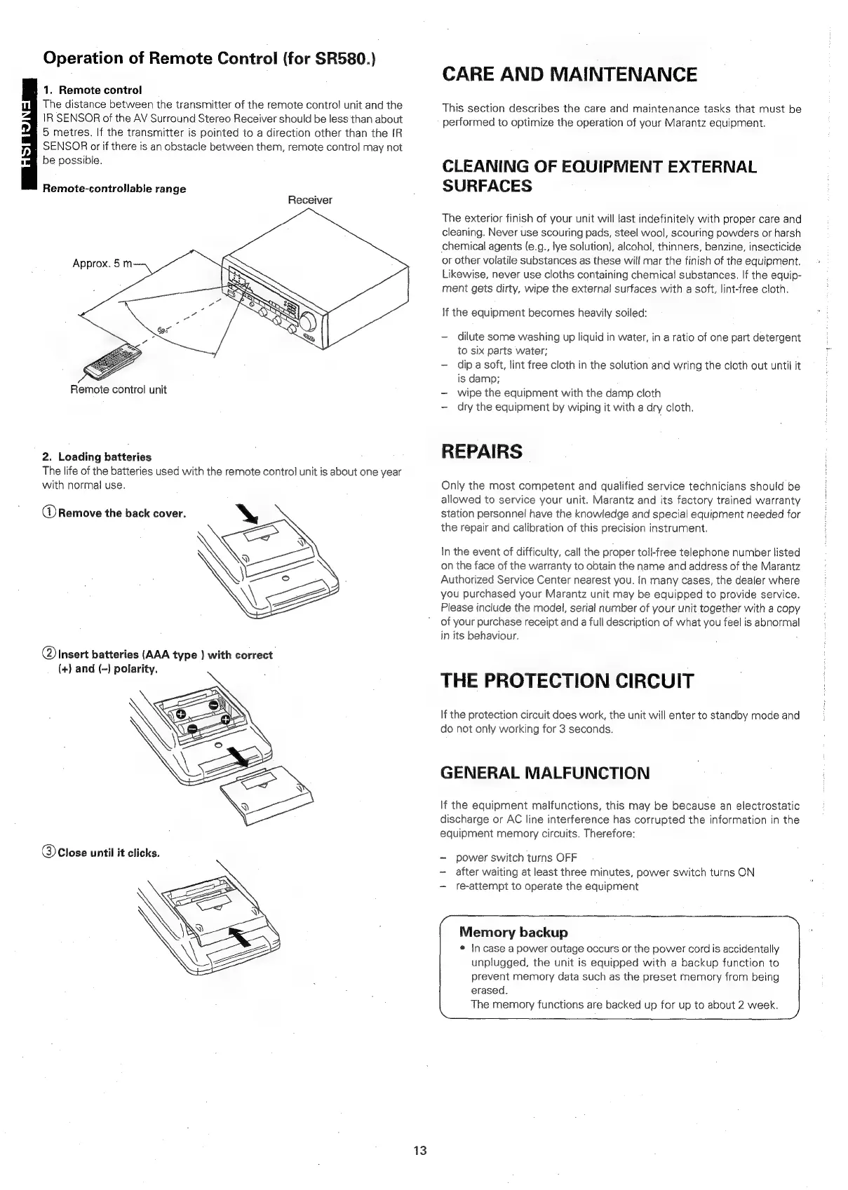 Marantz SR480 - CARE AND MAINTENANCE; CLEANING EXTERNAL SURFACES; REPAIRS AND SERVICE INFORMATION; PROTECTION CIRCUIT AND GENERAL MALFUNCTIONS