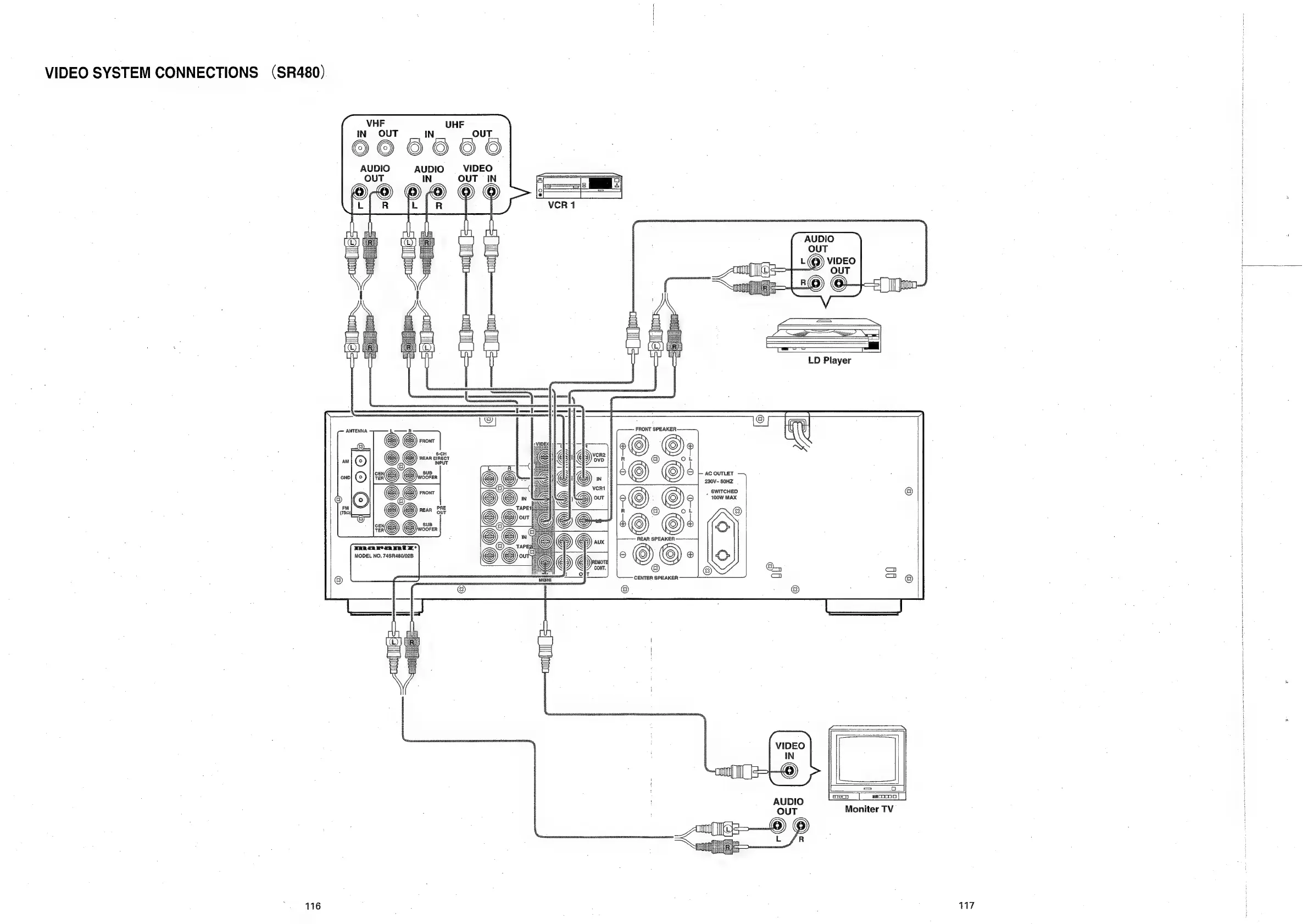Marantz SR480 - VIDEO SYSTEM CONNECTIONS (SR480); VCR, LD PLAYER, AND MONITOR HOOKUPS