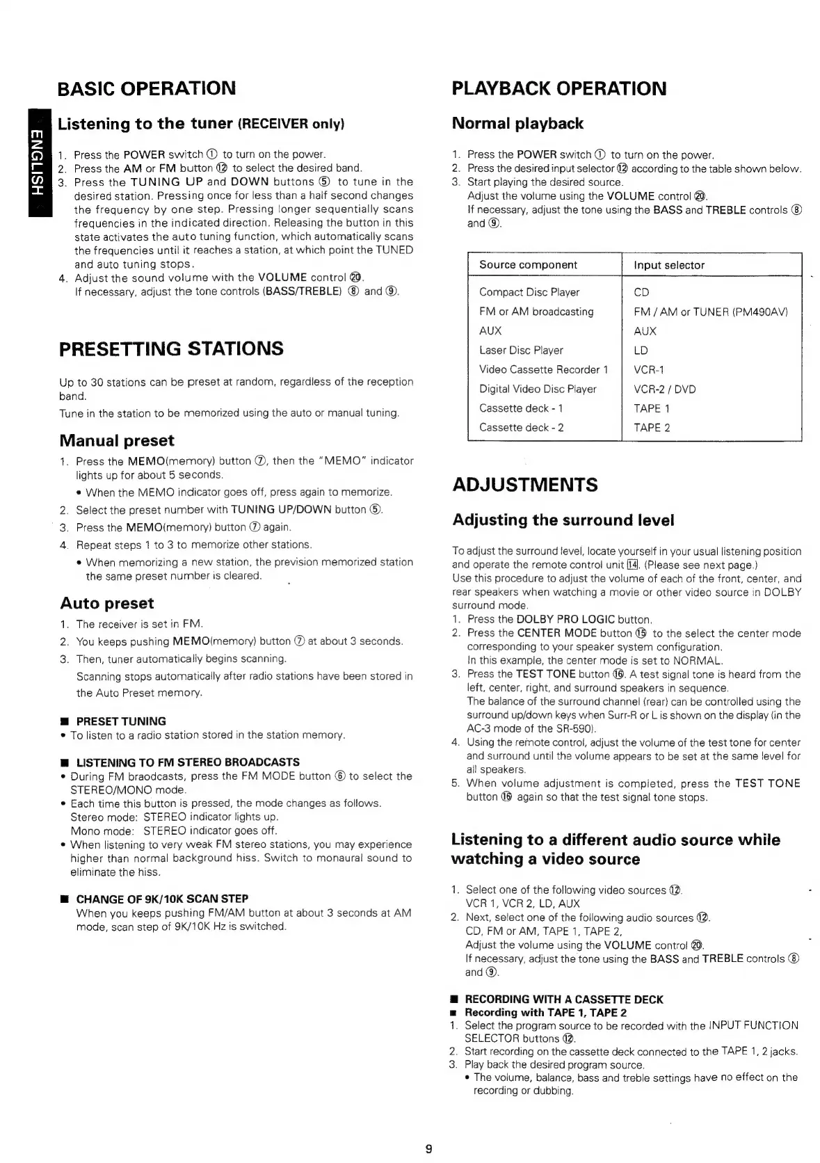 Marantz SR490 - Basic Operation; Playback Operation; Presetting Stations