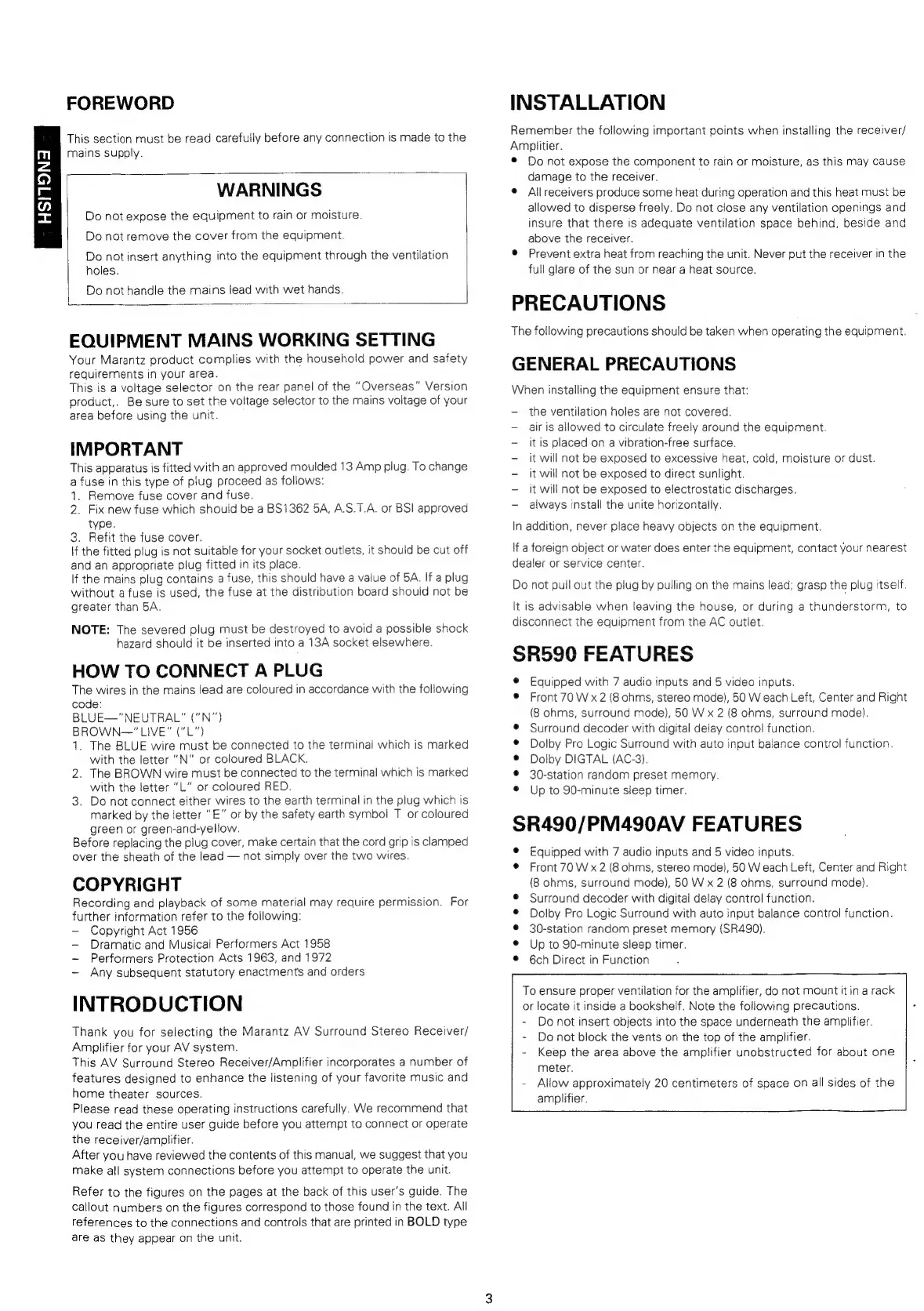 Marantz SR490 - Installation; Equipment Mains Working Setting