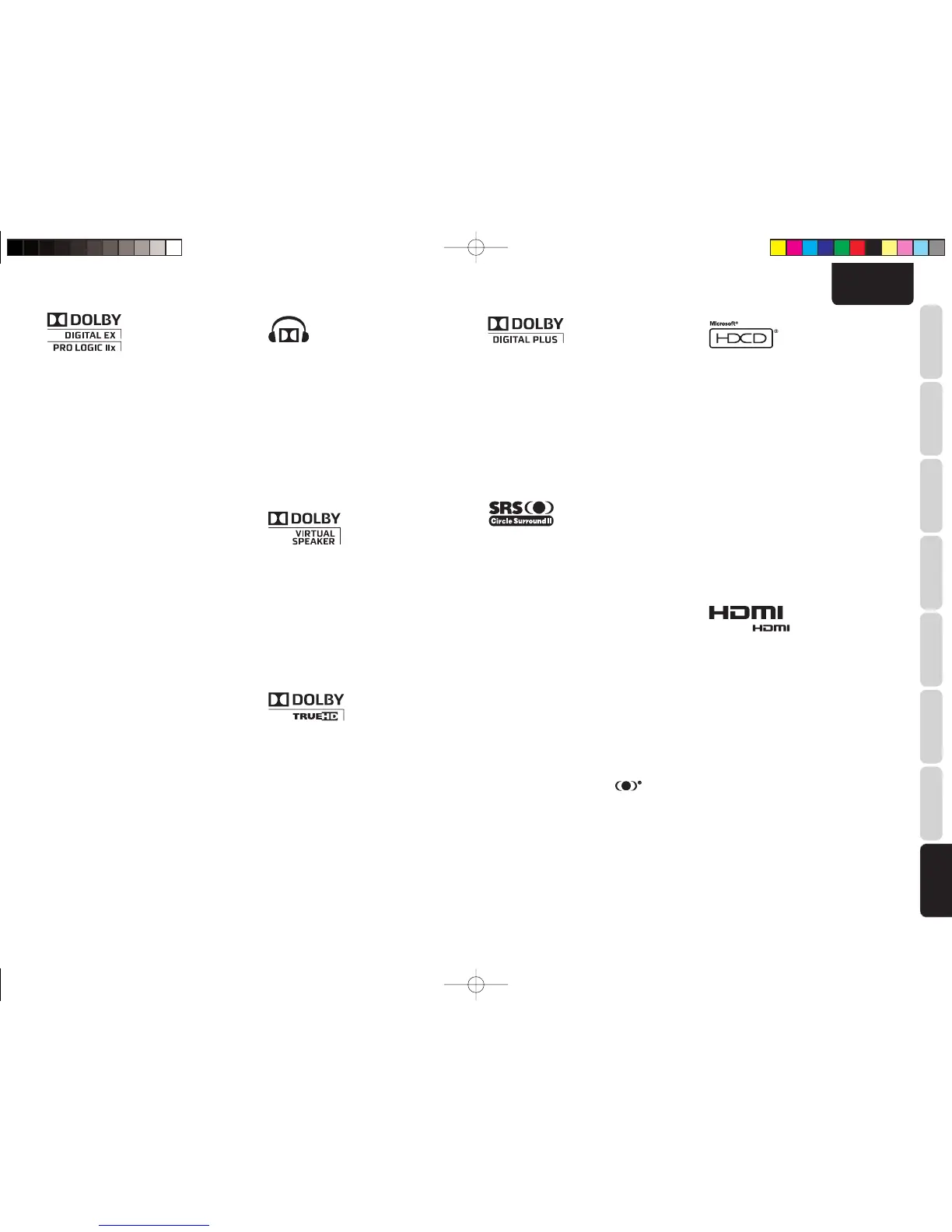 “Dolby”, “Pro Logic”, “Surround EX”, and the double-D