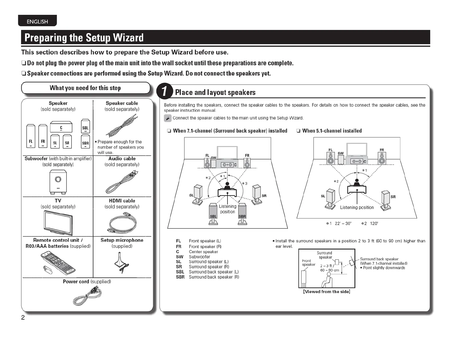 0 Speaker connections are performed using the Setup Wizard.