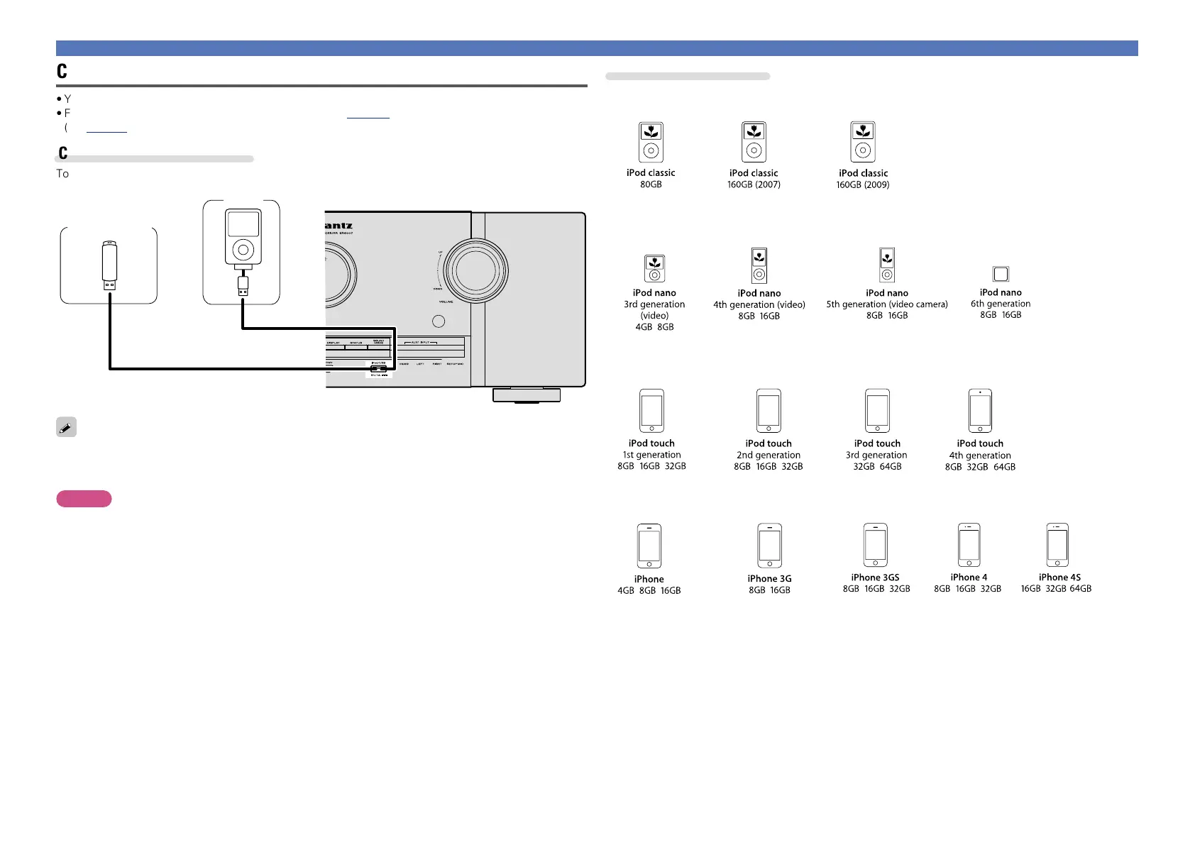 •For operating instructions see “Playing an iPod” (vpage 38) or “Playing a USB memory device”