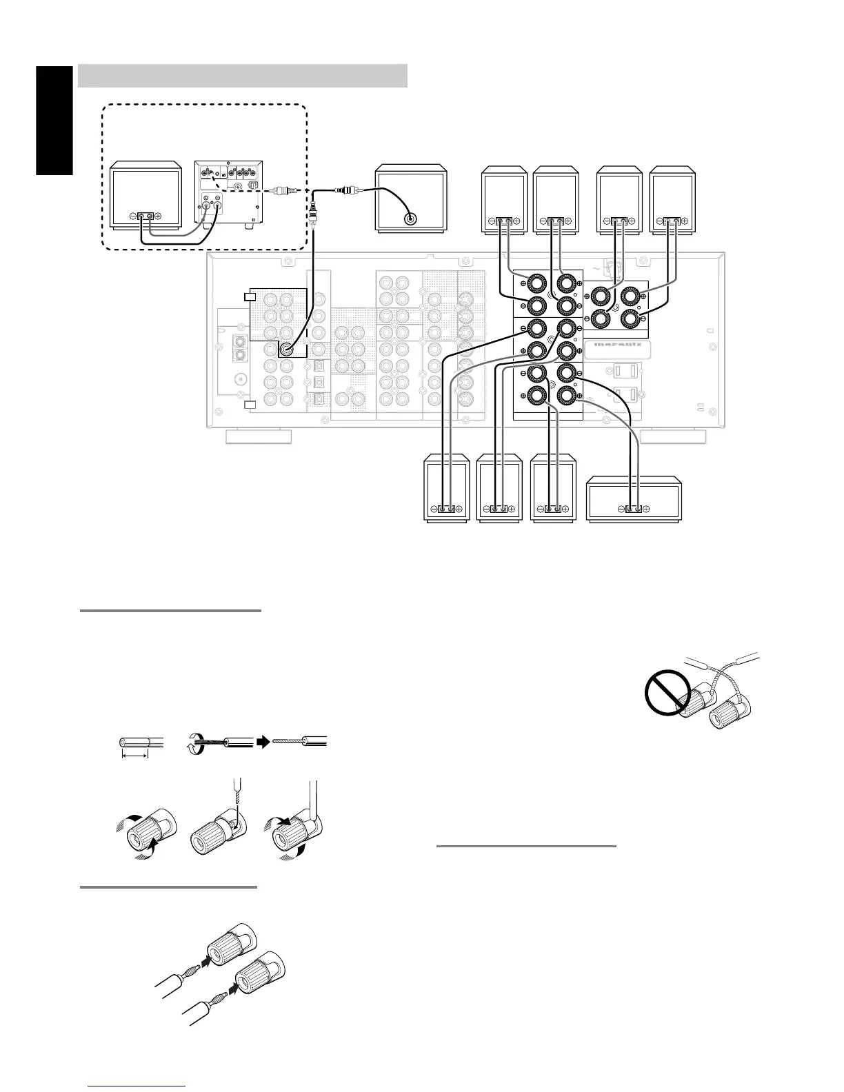 • Do not connect more than one speaker cable to one speaker