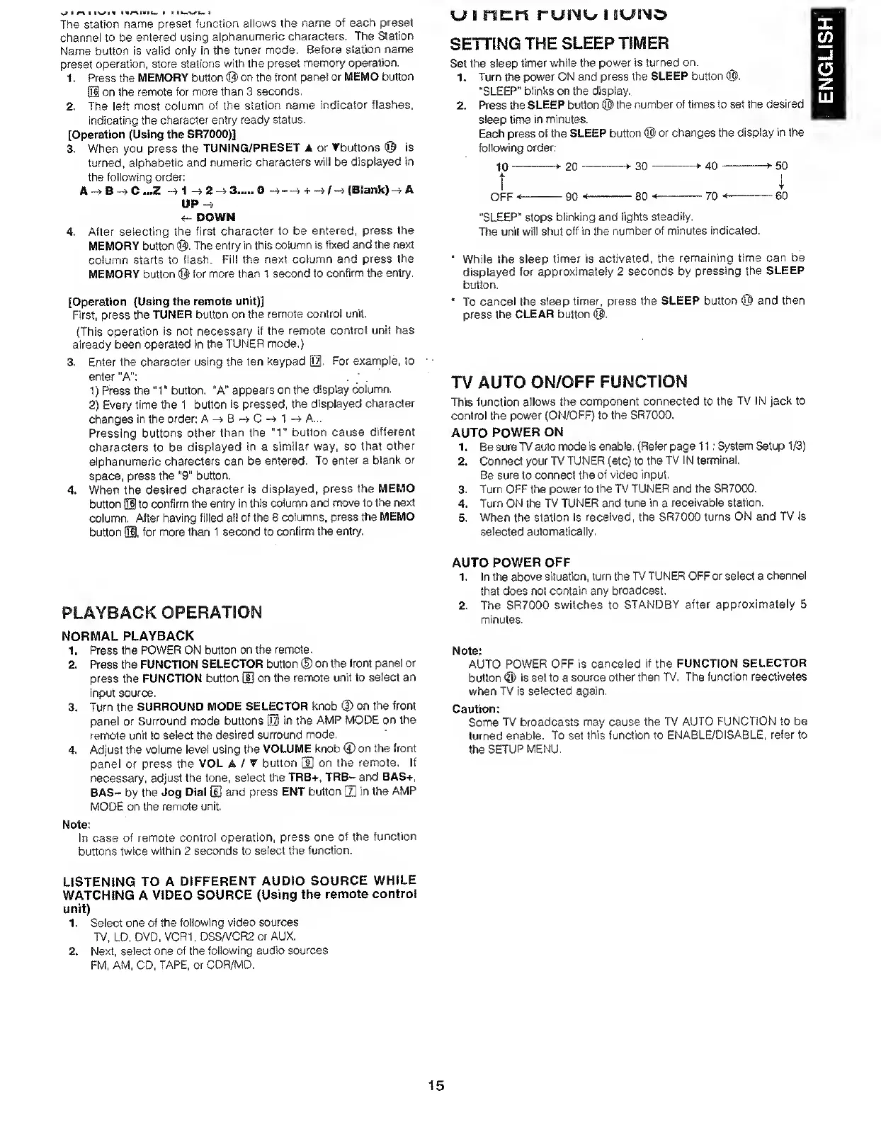 Marantz SR7000 - Listening to the Tuner; Setting the Sleep Timer (Only Remote Control Unit); Tv Auto On;Off Function
