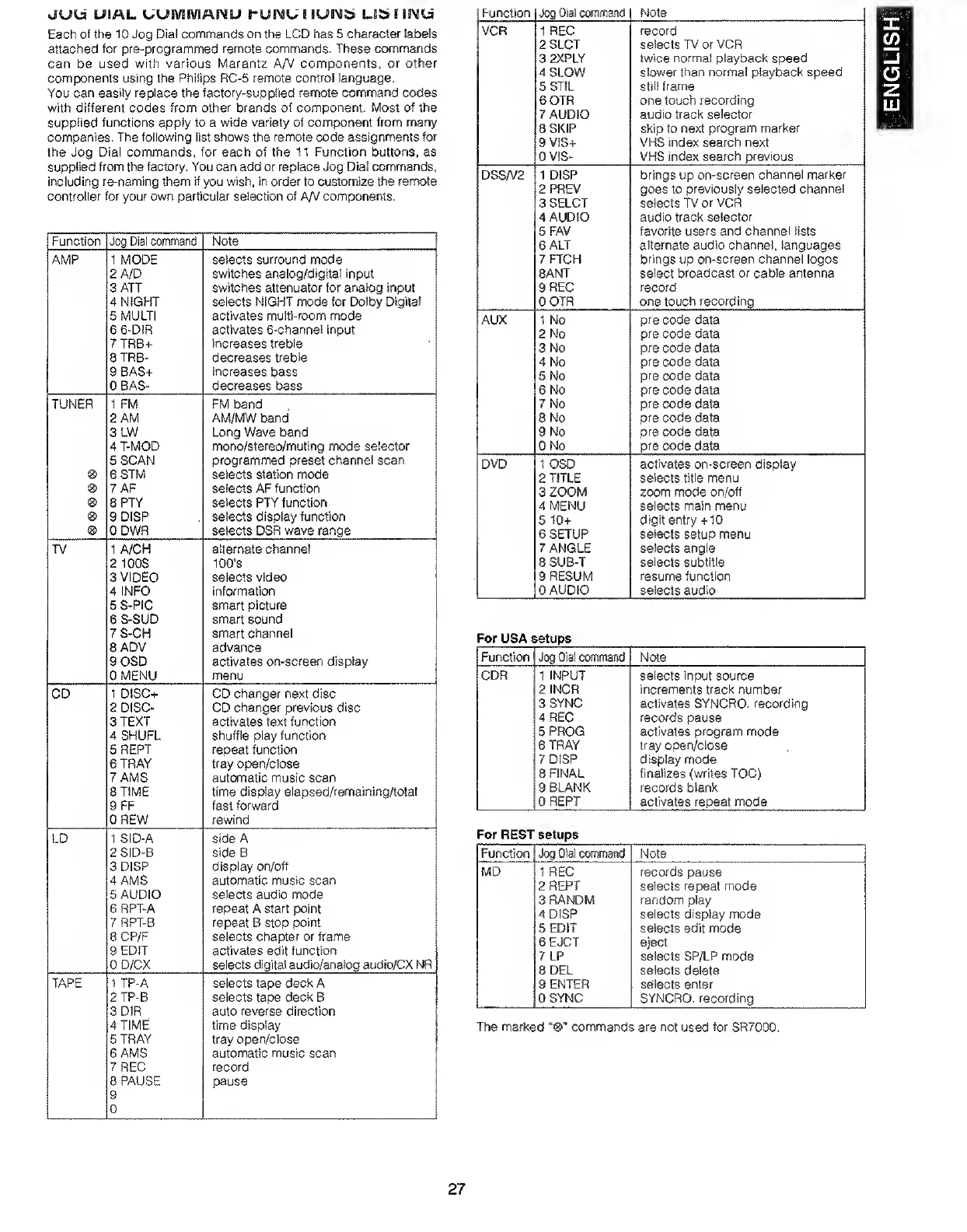 Marantz SR7000 - Jog Dial Command Functions Listing; AMP, VCR, DSS;V2, AUX, DVD Commands; CDR, TV, CD, LD Commands; TAPE, MD Commands