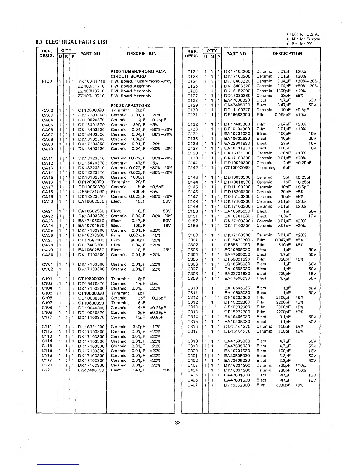 Marantz SR7100DC - Electrical Parts List: P100 Tuner;Phono Board; P100-Tuner;Phono Amplifier Circuit Board; P100 Capacitors; P100 Resistors