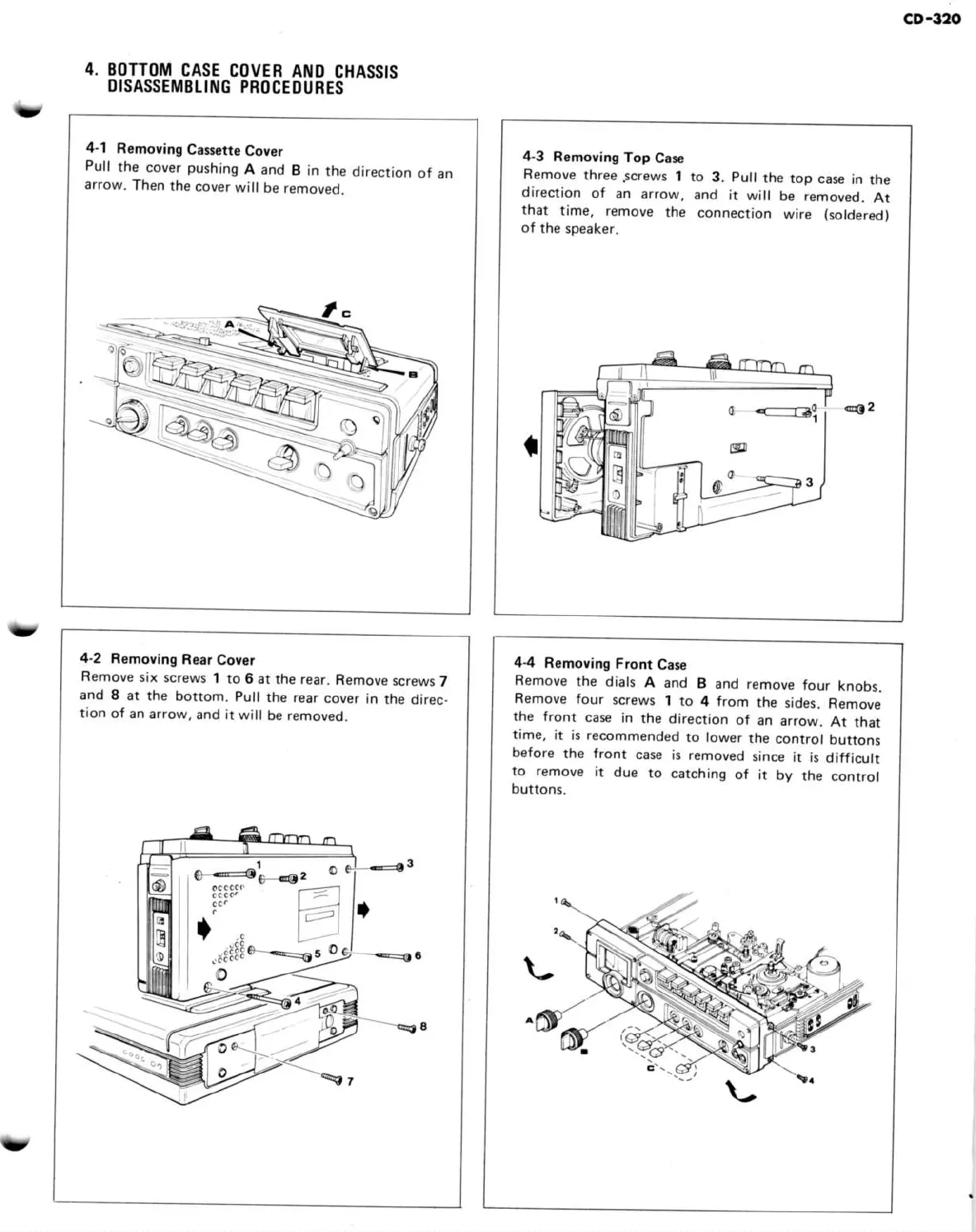 Marantz SUPERSCOPE CD-320 - 4. Bottom Case Cover and Chassis Disassembling Procedures; 4-1 Removing Cassette Cover; 4-2 Removing Rear Cover; 4-3 Removing Top Case