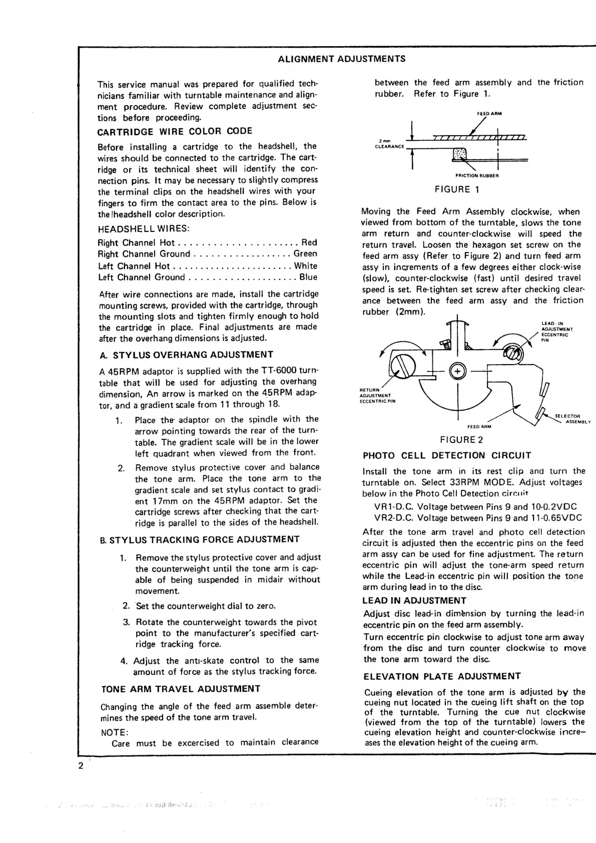 Marantz TT-6000 - Cartridge Wire Color Code; Stylus Overhang Adjustment; Stylus Tracking Force Adjustment; Tone Arm Travel Adjustment