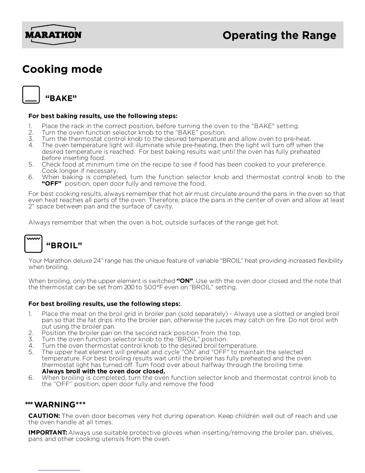 Marathon MER240 - Oven Cooking Modes; BAKE Mode Operation; BROIL Mode Operation