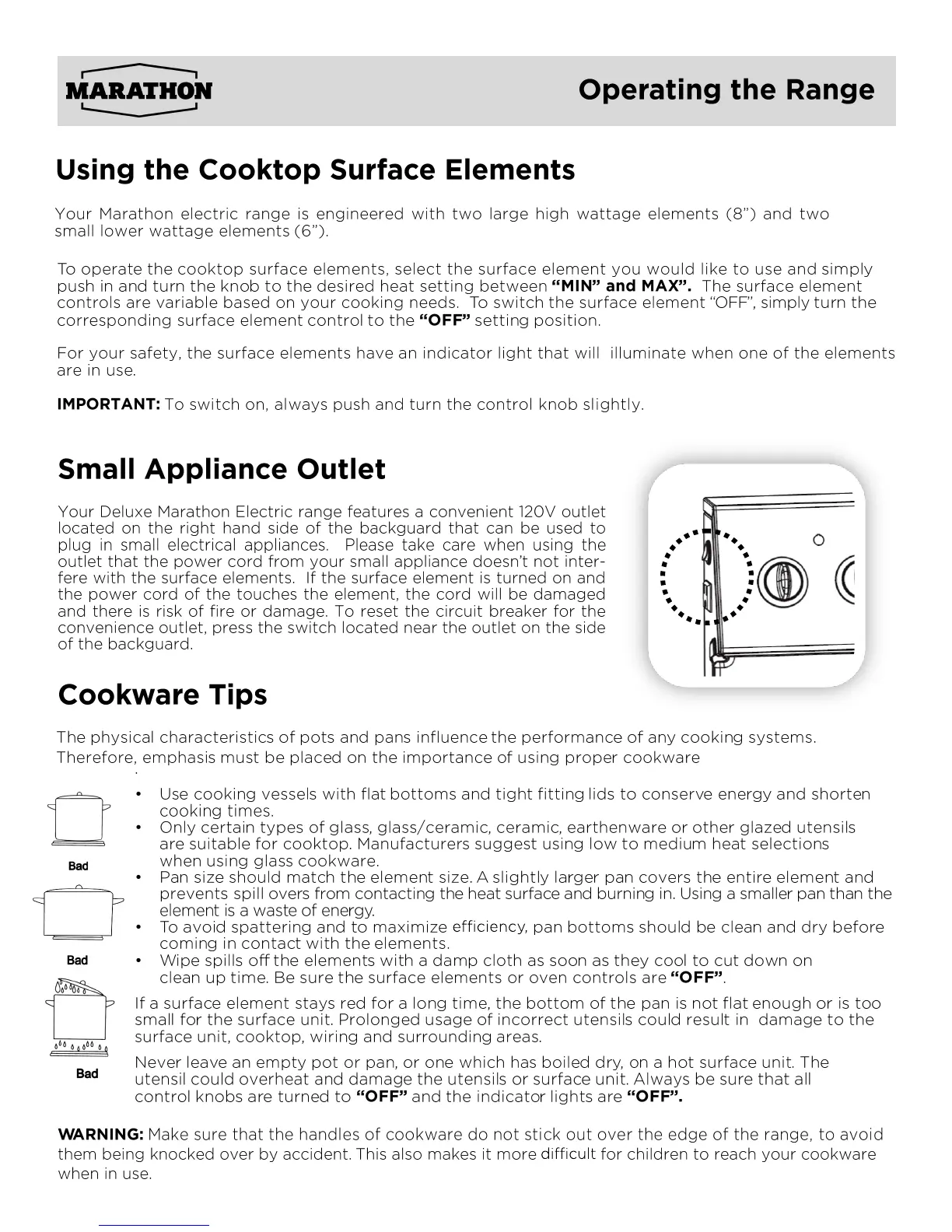 Marathon MER240 - Cooktop and Appliance Operation; Using the Cooktop Surface Elements; Small Appliance Outlet