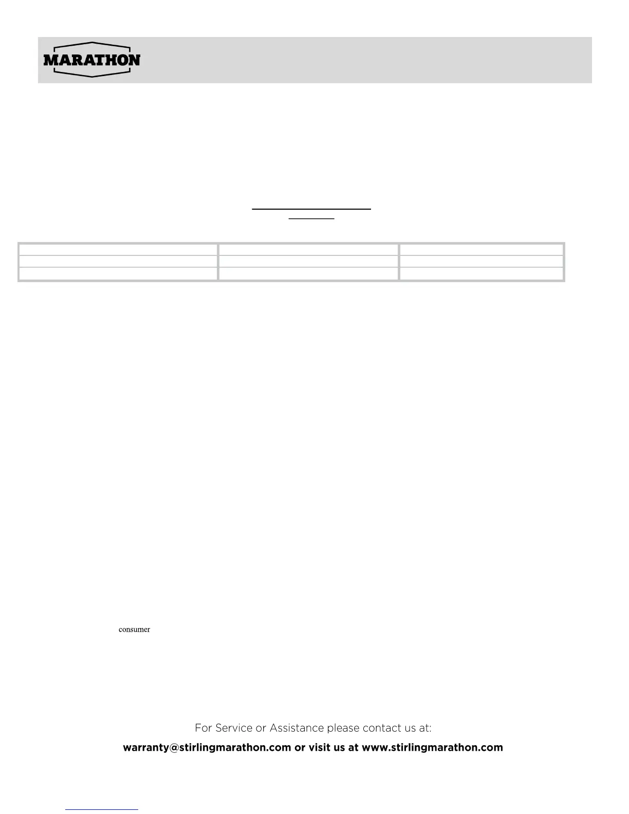When operated and maintained according to the instructions in the Use & Care Guide, Marathon, a registered trademark of Stirling Marathon Limited, agrees to repair or re-
