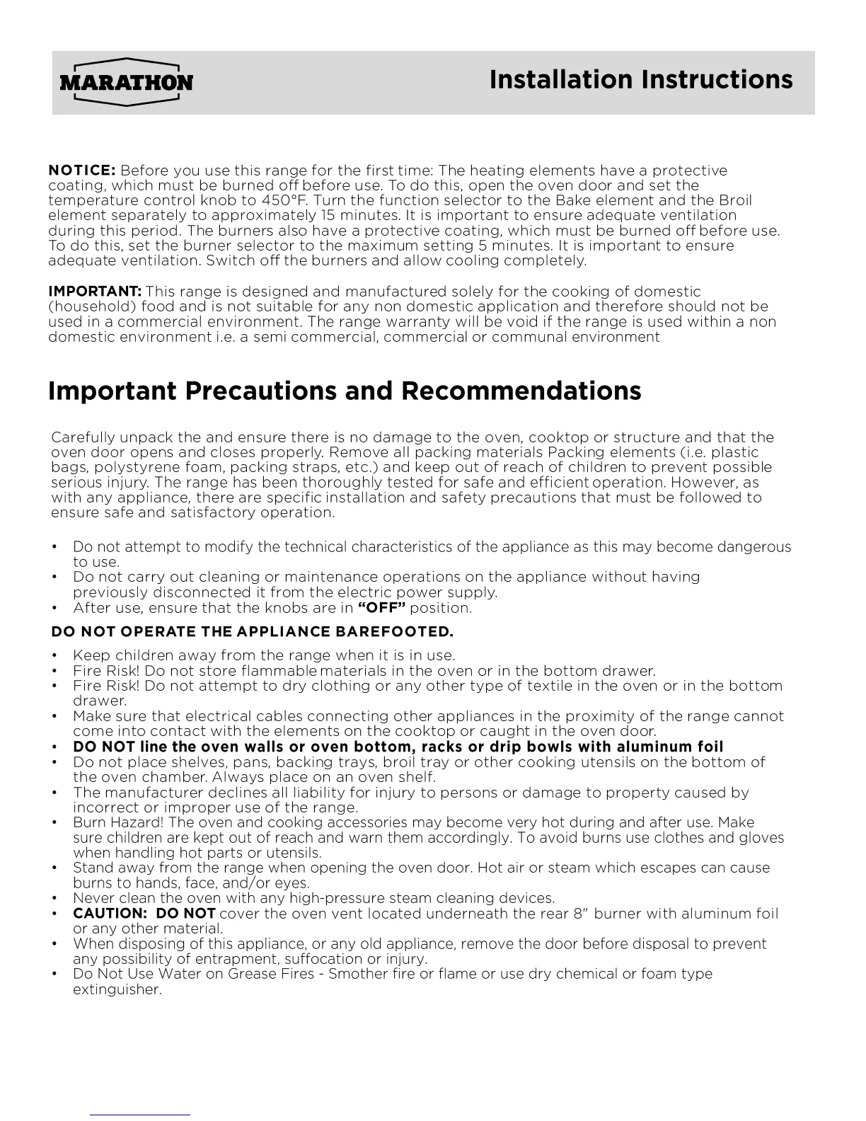 Marathon MER240 - Installation Instructions; Important Precautions and Recommendations; DO NOT OPERATE THE APPLIANCE BAREFOOTED; CAUTION: Oven Vent