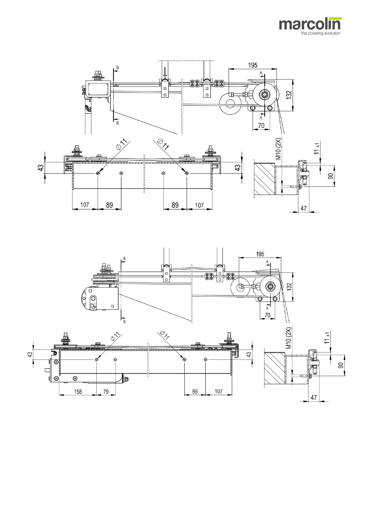 • Drill holes (Ø 11) of the fastening seats according to the dimensions shown in the figure above.