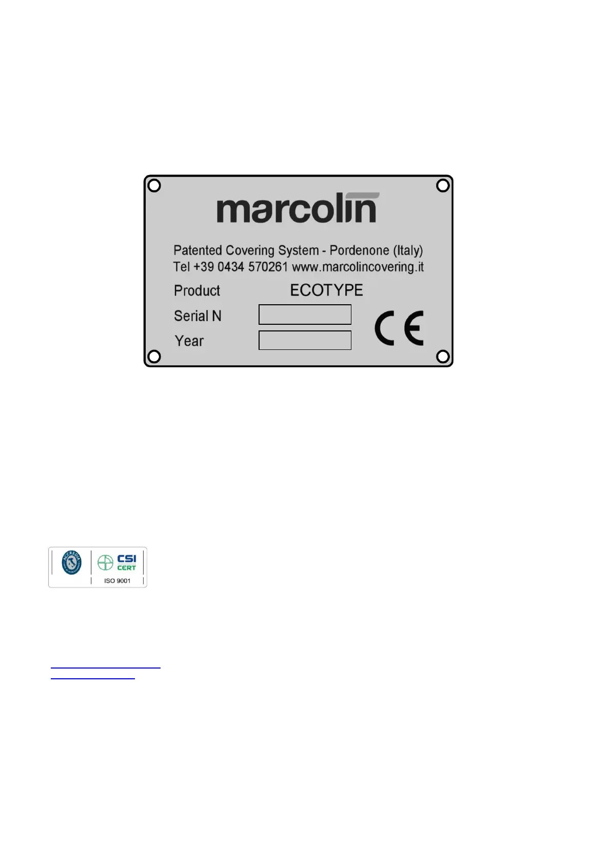 Marcolin Covering s.r.l. took great care in editing this manual, however, the company denies liability for errors and omissions, if present, and for personal
