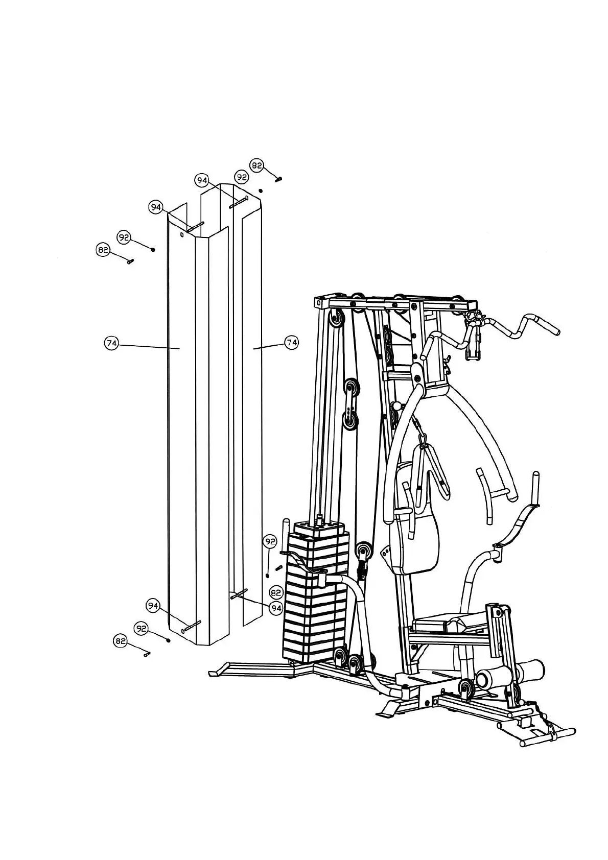 A.) Attach the two Weight Stack Covers (#74) with four 3” Sleeve (#94) to the Upper Frame (#1)