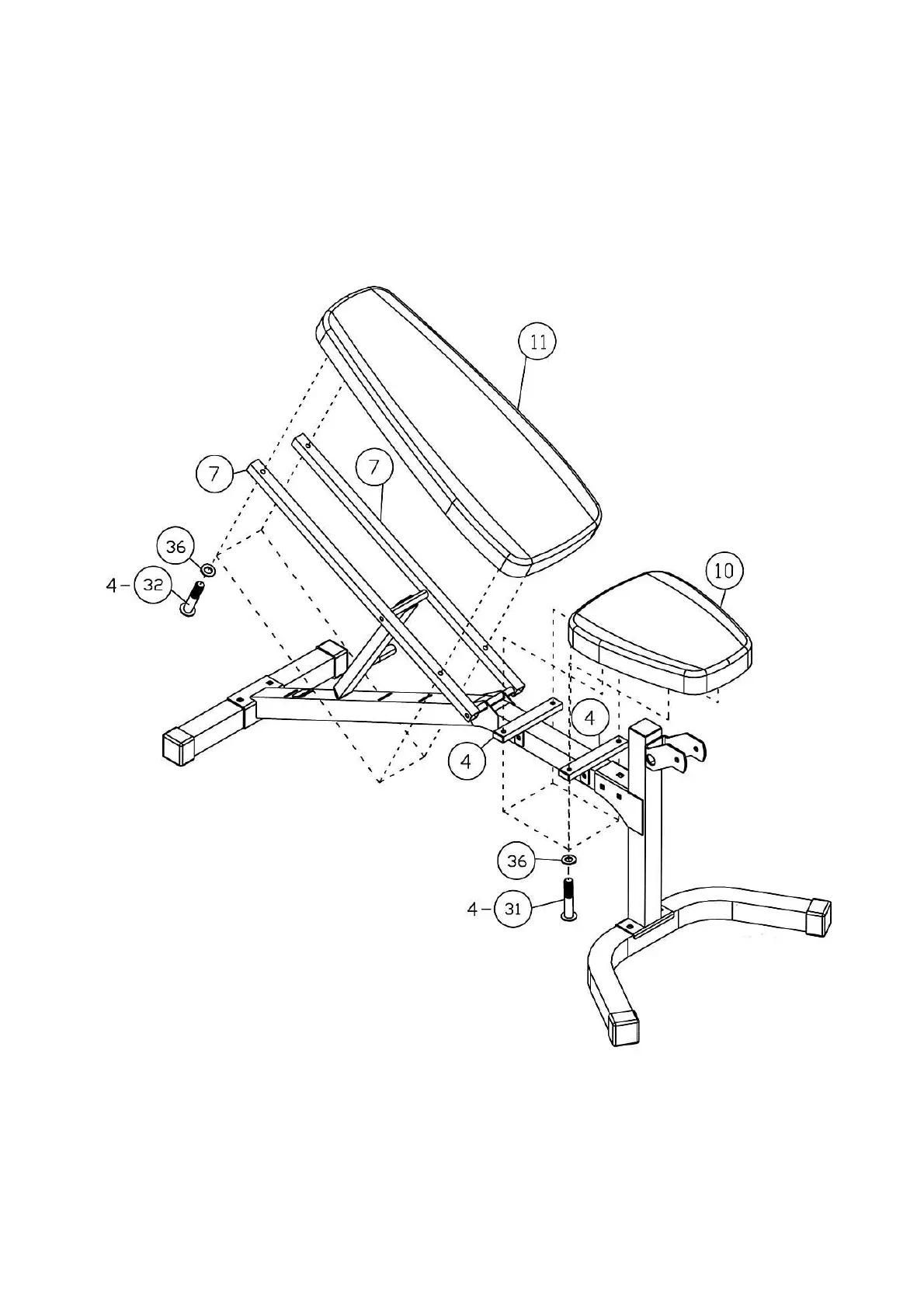 B.) Place the Seat Pad (#10) onto the two Seat Brackets (#4). Secure it with four M8 x 1