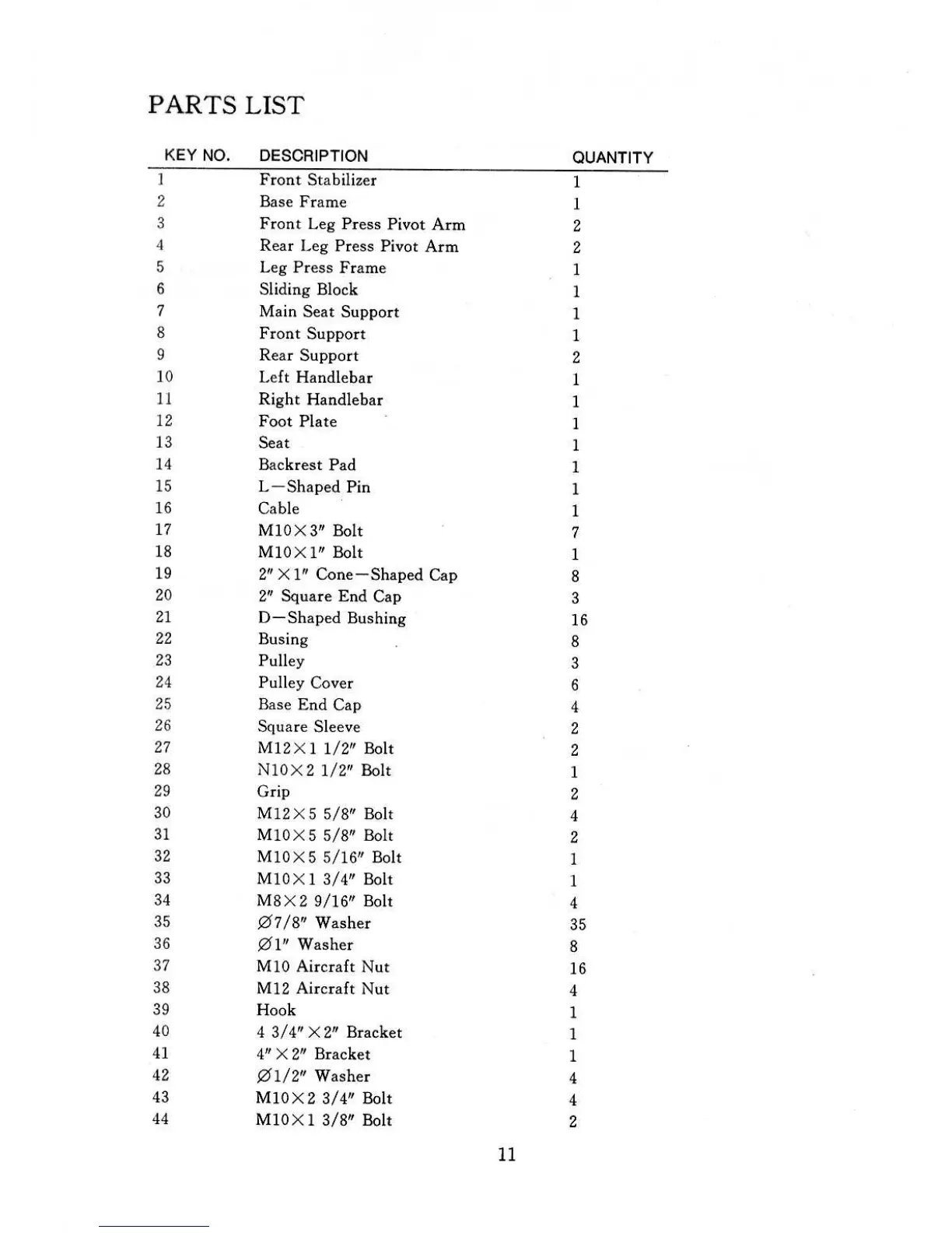 Marcy LP 90 - Parts List; Component Identification and Quantity