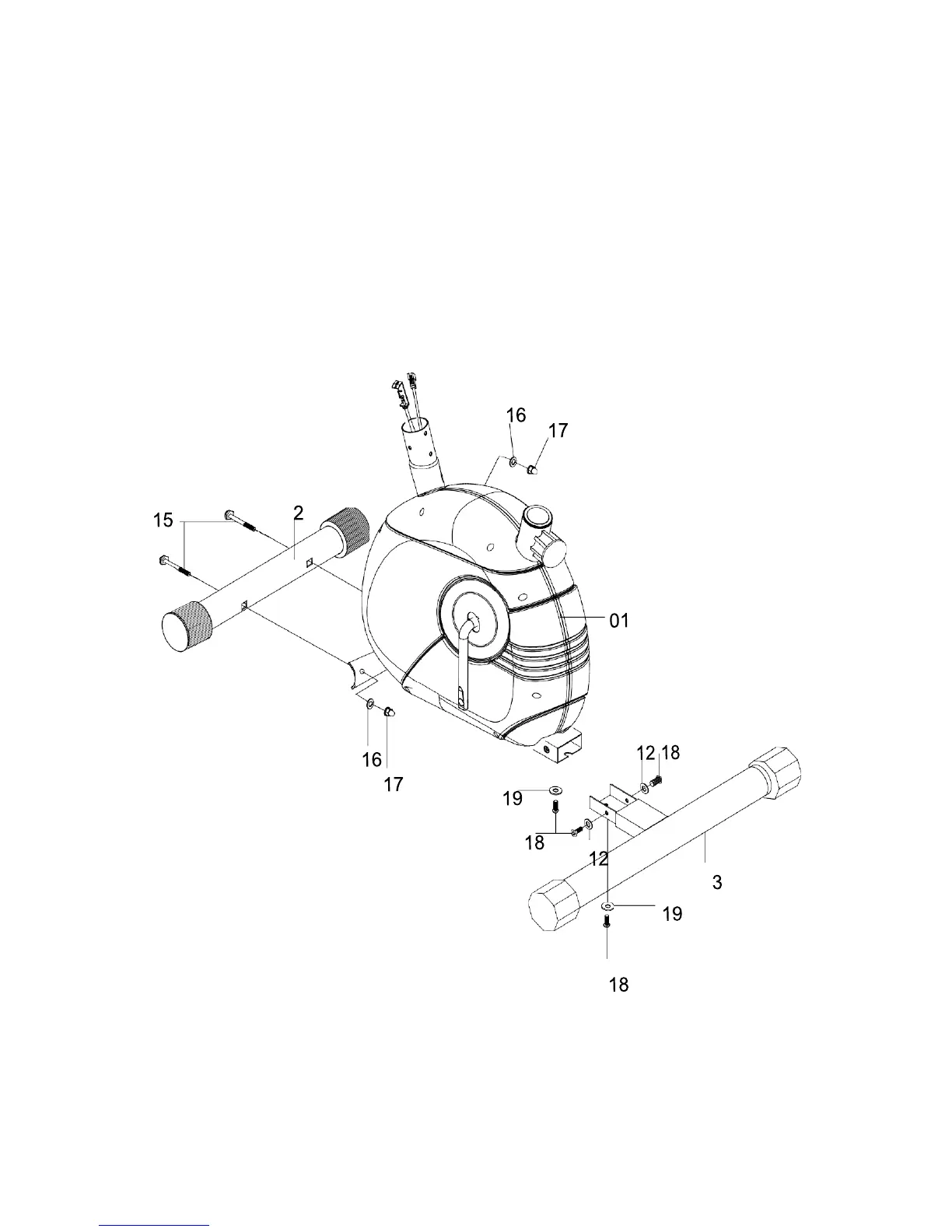 Attach the rear stabilizer (03) to the main frame (01), Secure using two allen screws (18),