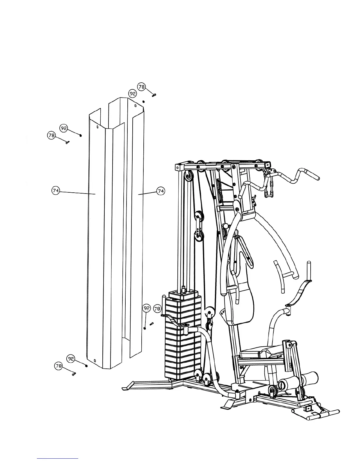 A.) Attach the two Weight Stack Covers (#74) to the Upper Frame (#1) and Rear Stabilizer (#15).