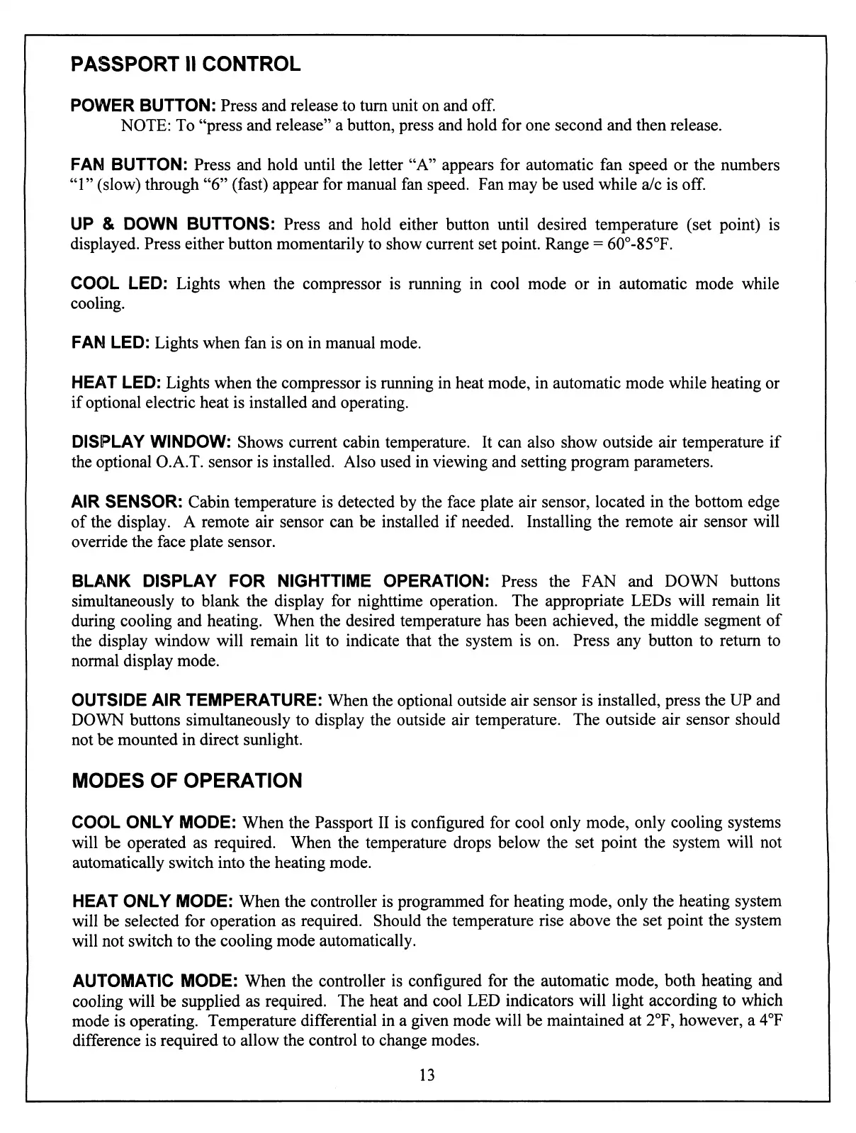 Marine Air Systems vector compact - Passport II Control; Modes of Operation