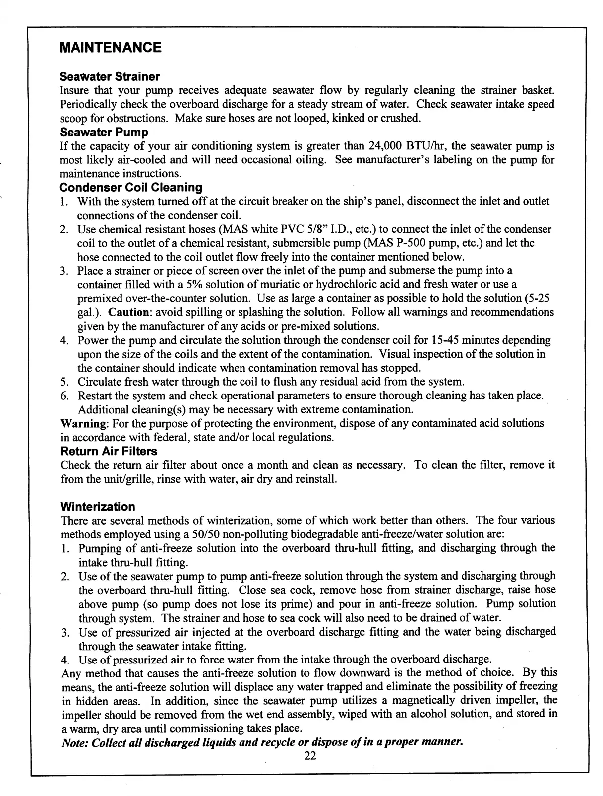 Marine Air Systems vector compact - Maintenance; Seawater System, Return Air Filters, Winterization