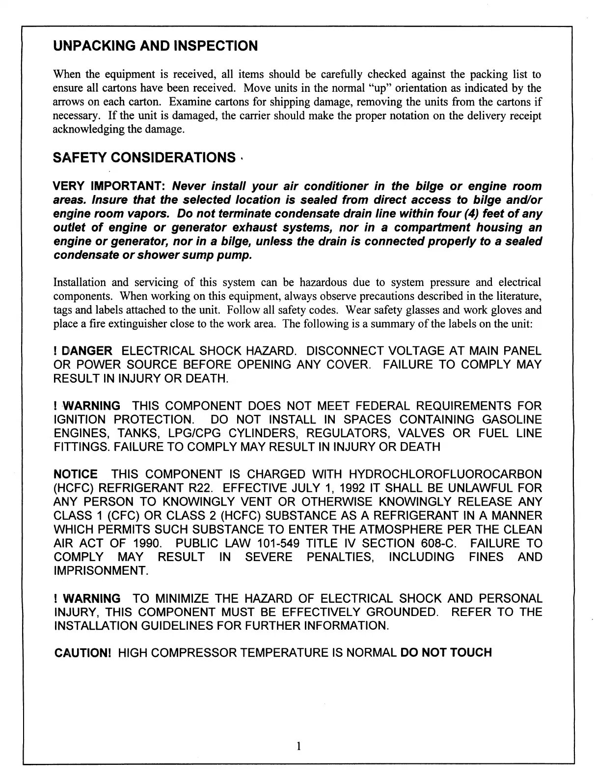 Marine Air Systems vector compact - Unpacking and Inspection; Safety Considerations