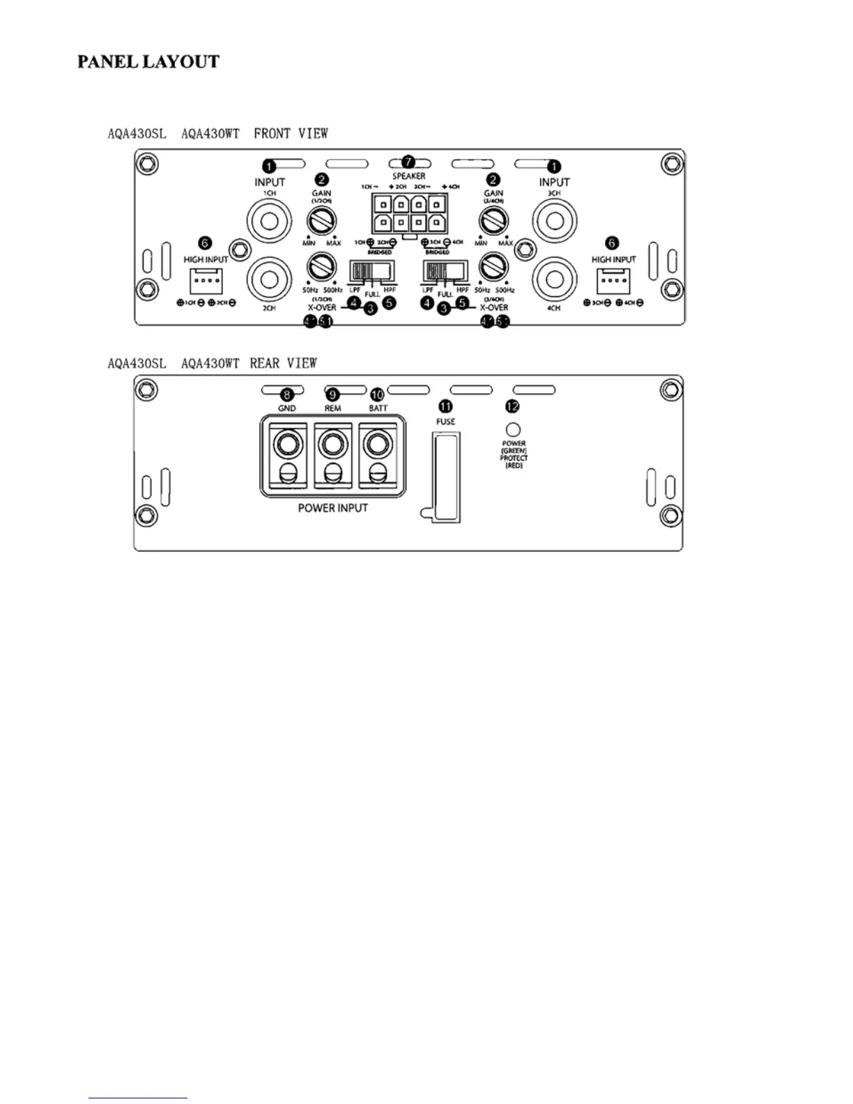 Mariner AQA430SL - Panel Layout; Front Panel View; Rear Panel View