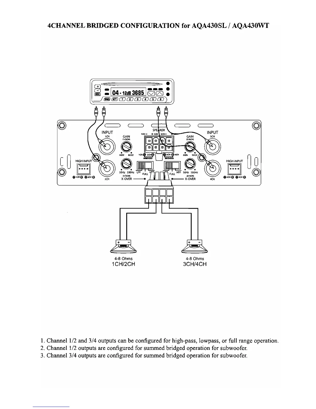 Channel 3/4 outputs are configured for summed bridged operation for subwoofer.