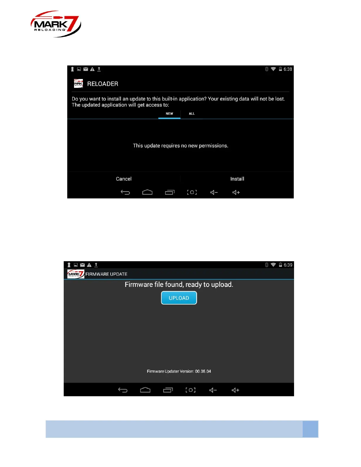 UPDATE, then press UPLOAD and press CLOSE when complete. Select the Reloader